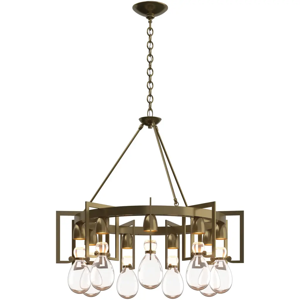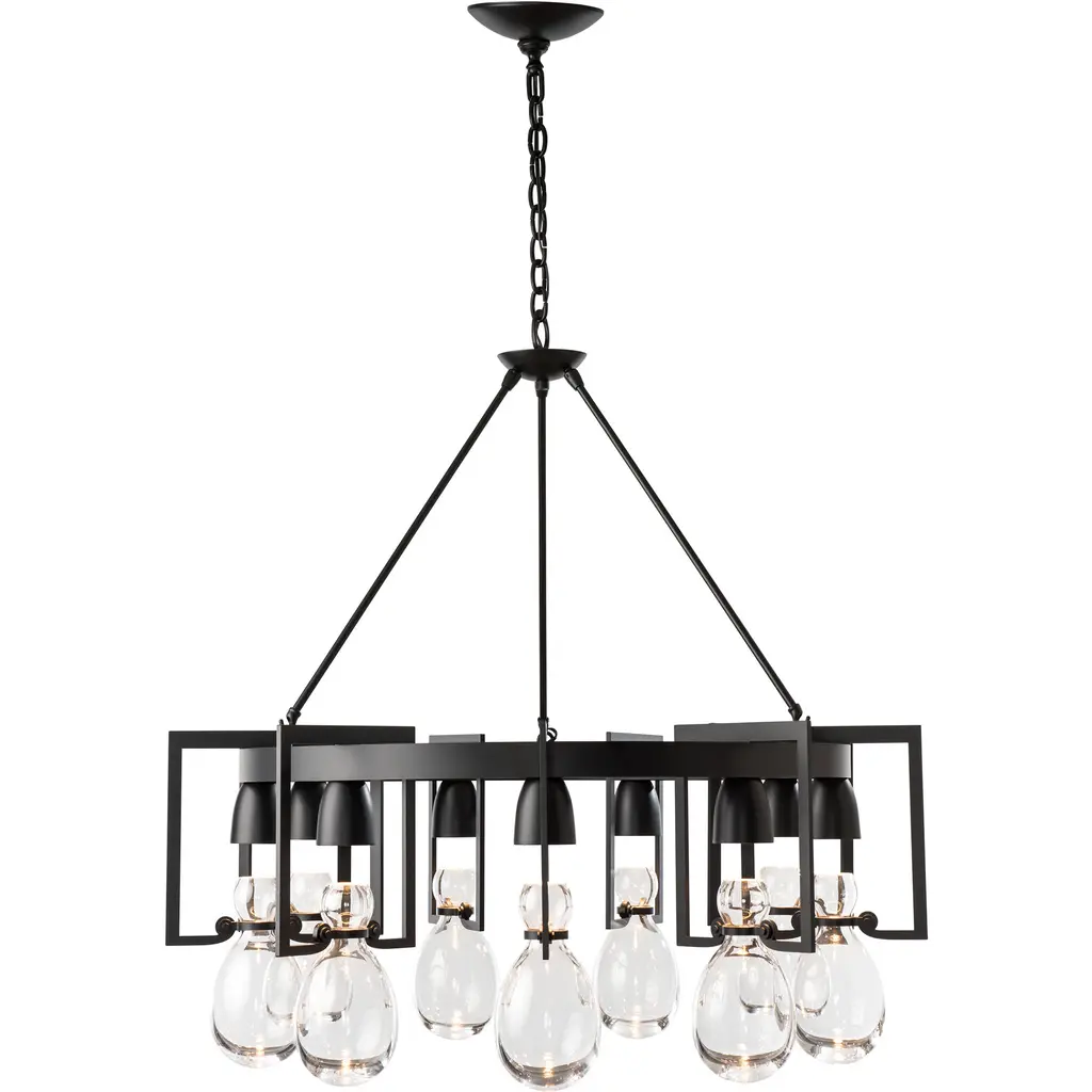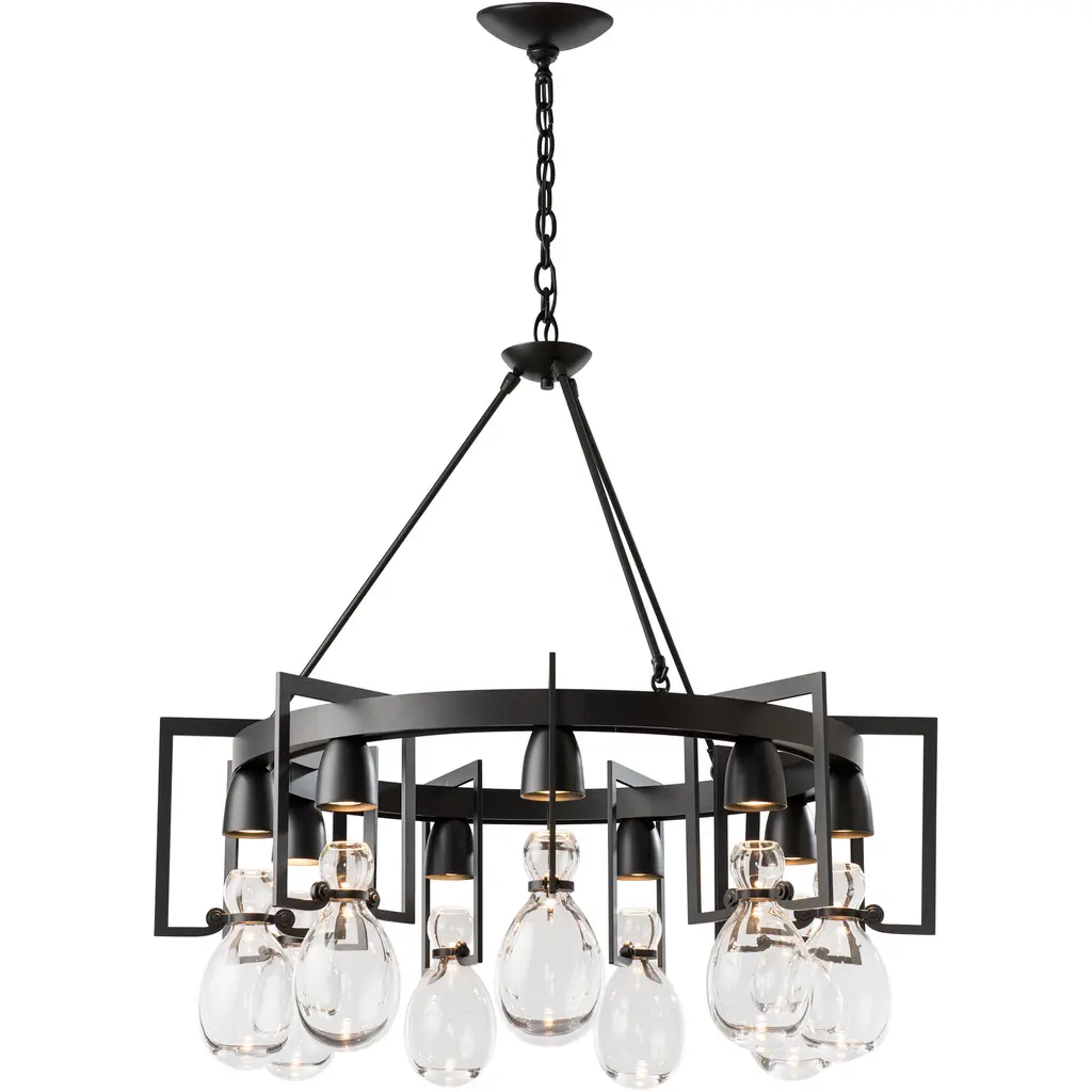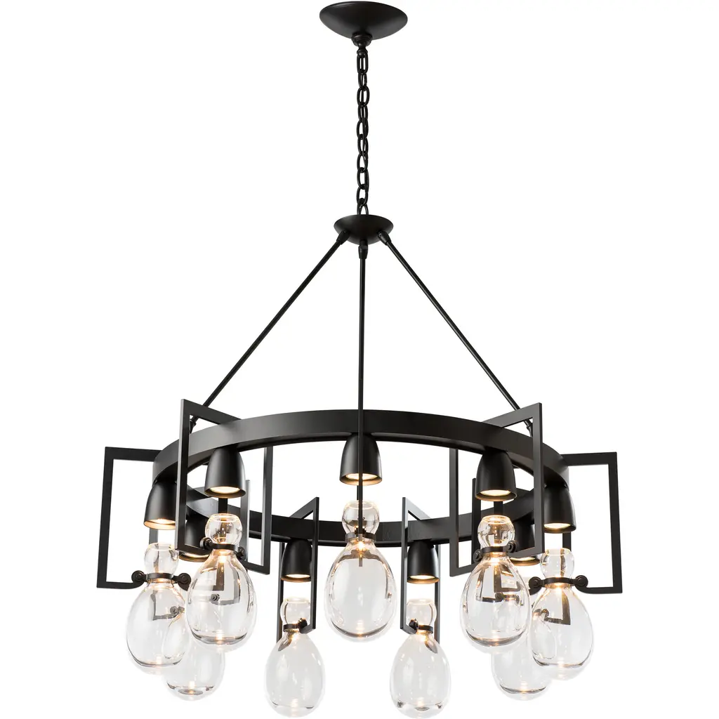 Gracefully held in place by detailed steel cuffs and a large circular frame, nine hand-blown hourglass vessels capture pools of downward light. The glass elements speak to the apothecary jars of an earlier time, while the metalwork reflects clean contemporary lines. The round Apothecary Chandelier is a part of Hubbardton Forge’s Apothecary Collection, blending simplicity in form with richness in materials and finish—easily adaptable to a wide range of styles.
