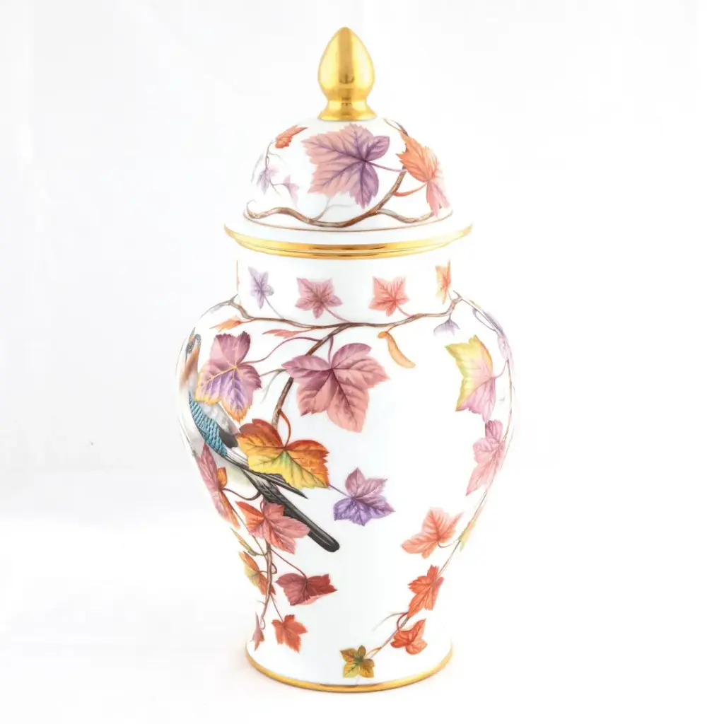 Summer green has given way to an autumnal explosion of color on this climbing vine which means this bird will soon depart its summer home for southern destinations. This feathered beauty was a shy resident, preferring to hop around behind the cover of leaves and branches, but the neighborhood got to know it nonetheless through its daily songs. When Mother Nature awakens in the spring and restores the bird's sanctuary, the village knows the bird's lullabies will soon return as well. Now the biggest porcelain manufactory in Europe, Herend was founded in 1826 to produce earthenware in the small Hungarian village for which it was named. At the time, Hungary was flooded with low-cost pottery, but in 1839, Mor Fischer became the Manufactory’s new owner and he decided to focus on producing dinnerware replacement pieces for Europe’s royal families to complement their valuable porcelain patterns from Germany and the Far East. As his client base grew, Fischer commissioned his artists to begin designing dinnerware patterns of their own. Queen Victoria’s 1851 purchase of a large set for Windsor Castle was a milestone, setting the stage for aristocrats throughout Europe to clamor for Herend in their estates. In the 1850s, Herend added meticulously-crafted figurines to its creations. Herend’s trademark fishnet pattern, which is widely recognized and prized as Herend’s signature design, started in 1858 when an artist who was intrigued with a Chinese plate’s fish scale design painted it onto a rooster figurine to imitate feathers.
