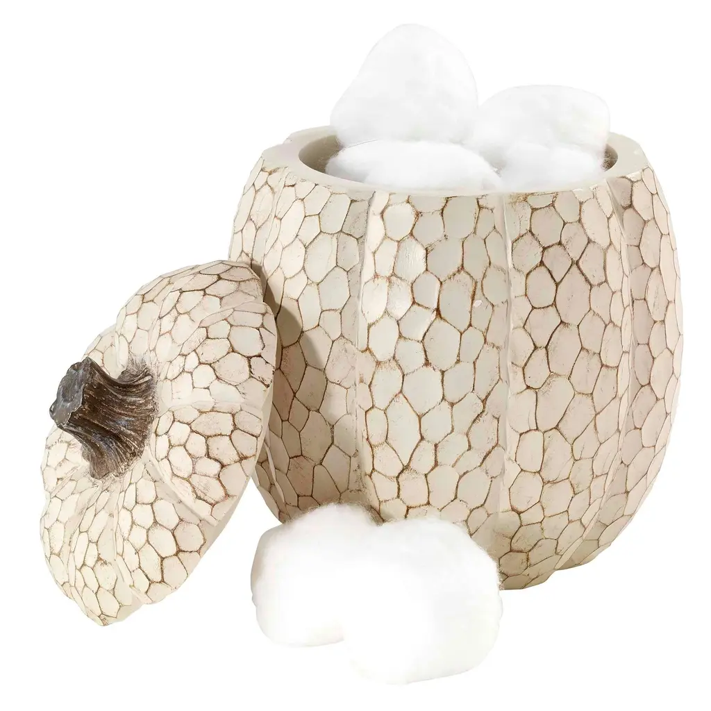 The Avanti Grateful Patch Covered Jar features a textured pumpkin off-white with a life-like stem for a pull. Made of durable, hand-painted resin. The perfect touch of fall for any décor or room-bathroom, kitchen, office or anywhere you need extra storage .