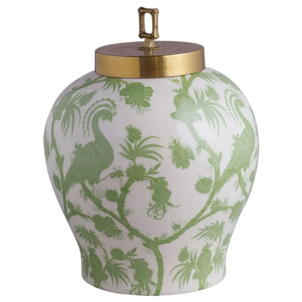 Balinese peacock is a nineteenth century archival French roller print. Decidedly a South Seas look, the Scalamandre' pattern is rendered in exotic motifs of fruit, foliage and peacocks with delicate batik-like details. The jars are made of porcelain with solid brass metal lift off lids. Measurements: 15"H x 12" Diameter Materials: porcelain, brass.