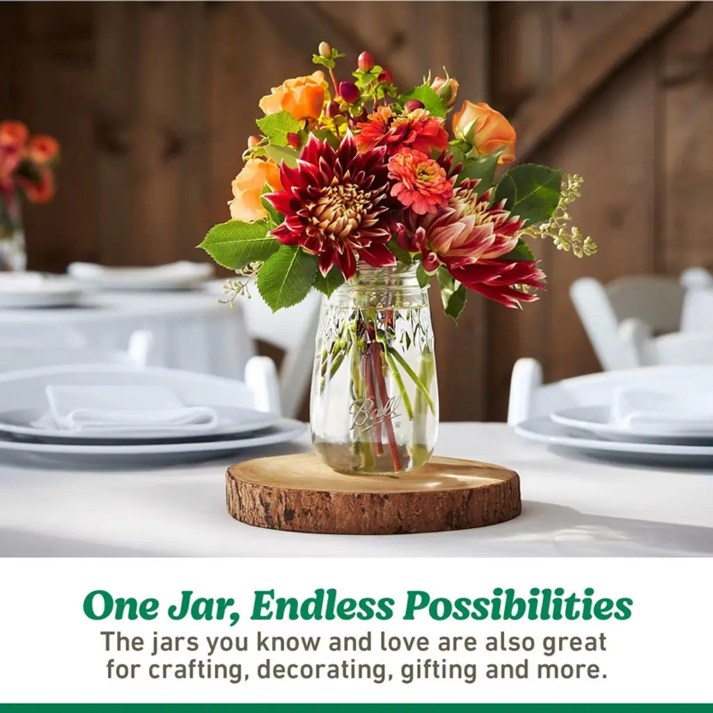 Featuring a classic design that offers ideal versatility for canning, crafting, and home organization projects, Ball Wide Mouth Glass Mason Jars help capture your creativity. These 16 oz. mason jars with lids have a timeless design that moves effortlessly from the panty to the table, and are great for preserving fresh recipes such as salsas, syrups, sauces, fruits, and vegetables. In addition to preserving, these wide mouth mason jars are also great for serving, creative decor, and gift giving. The included lids and bands create airtight seals while canning to keep your creations fresh and delicious. This set of 12 reusable mason jars is BPA-free and proudly made in the USA with globally sourced materials.
