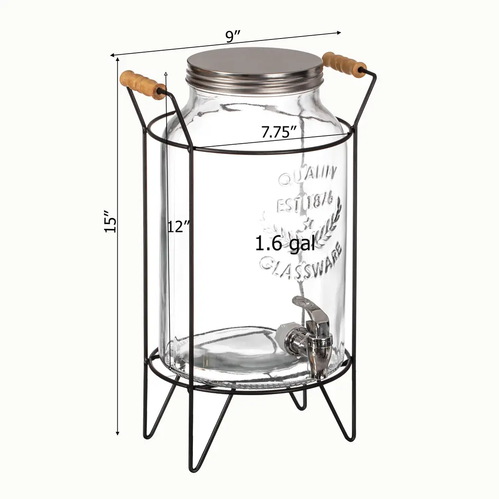 Basicwise 1.6-Gallon Glass Drink Dispenser With Stainless Steel Spigot – Water And Juice Container, Lemonade Stand - Clear