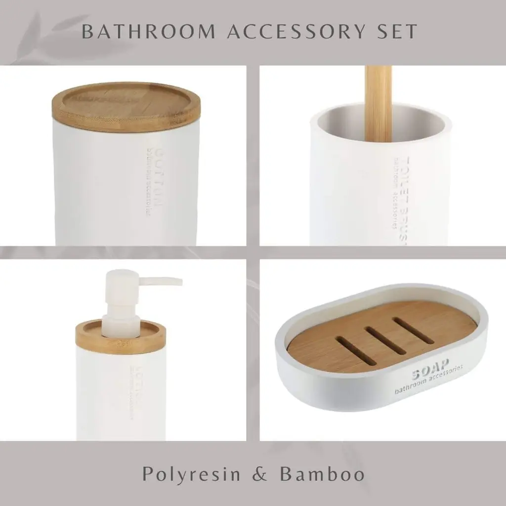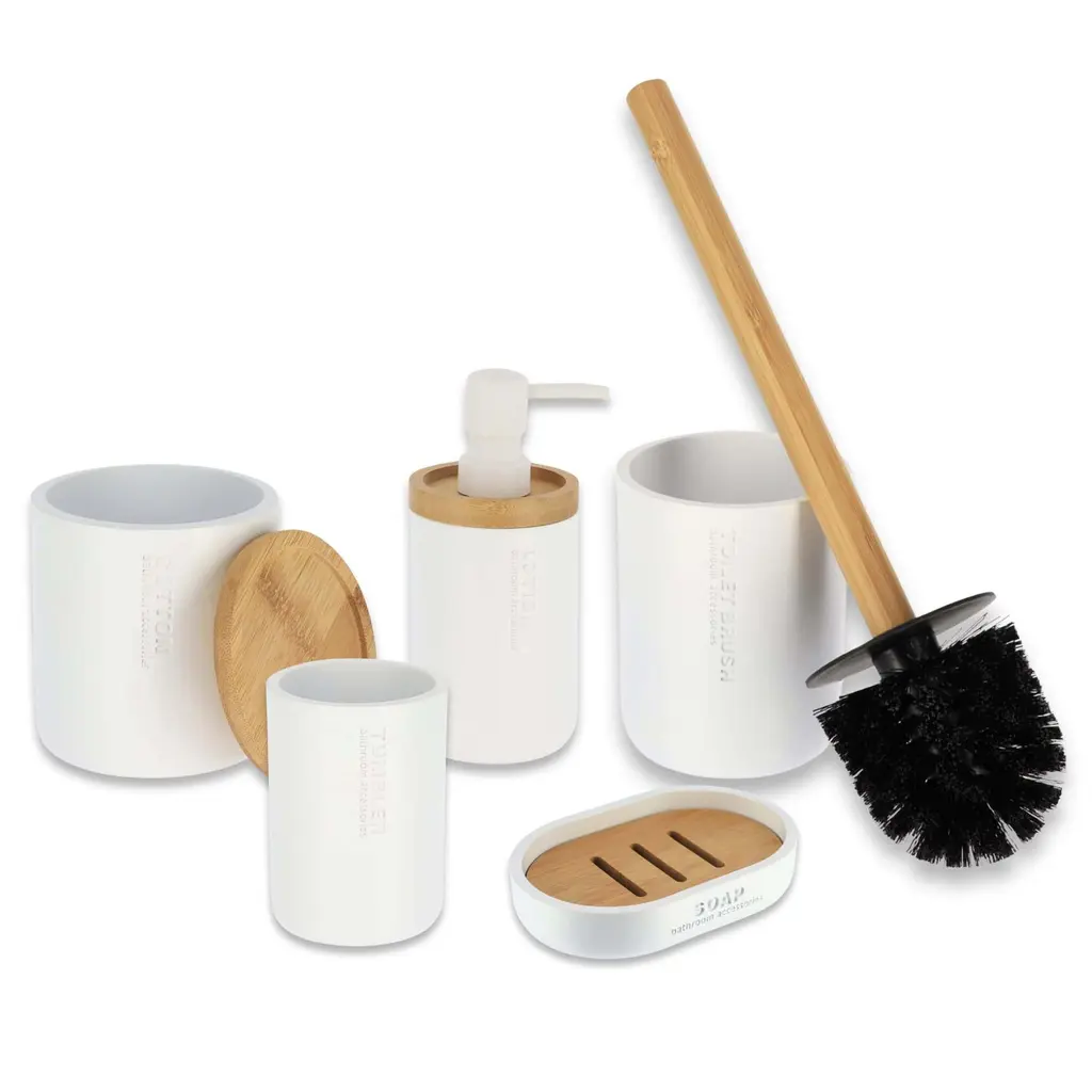 LUXURIOUS AESTHETIC: Elevate your bathroom with our bathroom essentials set, featuring natural bamboo detailing. Choose from a variety of colors to personalize your space5-PIECE COLLECTION: This complete set includes a toothbrush cup, soap dispenser, toilet brush, cotton jar and soap dishHIGH QUALITY: Made from durable polyresin, each element of this bathroom accessory set combines functional strength with a sophisticated matte finish and bamboo accentsSIMPLE MAINTENANCE: Easy-to-clean surfaces keep these bathroom accessories looking like new, combining functionality and style effortlesslyVERSATILE USE: Perfect for any bathroom, this bath essentials set adds a touch of sophistication to guest bathrooms, master bathrooms, or even commercial spacesUpgrade your bathroom with our Complete Set of Bathroom Accessories. Elegantly enhanced with bamboo detailing, this bathroom accessory kit combines sleek design with practicality. This 5-piece ensemble includes a liquid soap dispenser, tumbler, cotton holder, toilet bowl brush, and bar soap holder. First, the soap dispenser offers a smooth, easy-to-use design, compatible with various liquid soaps and lotions. The tumbler cup serves as a versatile holder for toothbrushes or make-up accessories. Additionally, the cotton box is an elegant solution for storing cotton balls, buds, or other bathroom essentials. The toilet brush holder is discreet and preserves the coherent look of the bath set. Finally, the soap holder is designed to keep your soap in place, ensuring a tidy sink. The durability of this polyresin bath décor set is a key feature. The neutral palette and bamboo accents add sophistication to any bathroom décor. Our Complete Set of Bathroom Accessories meets functional needs and enhances the aesthetic appeal of your bathroom. Imported from France, Made in China