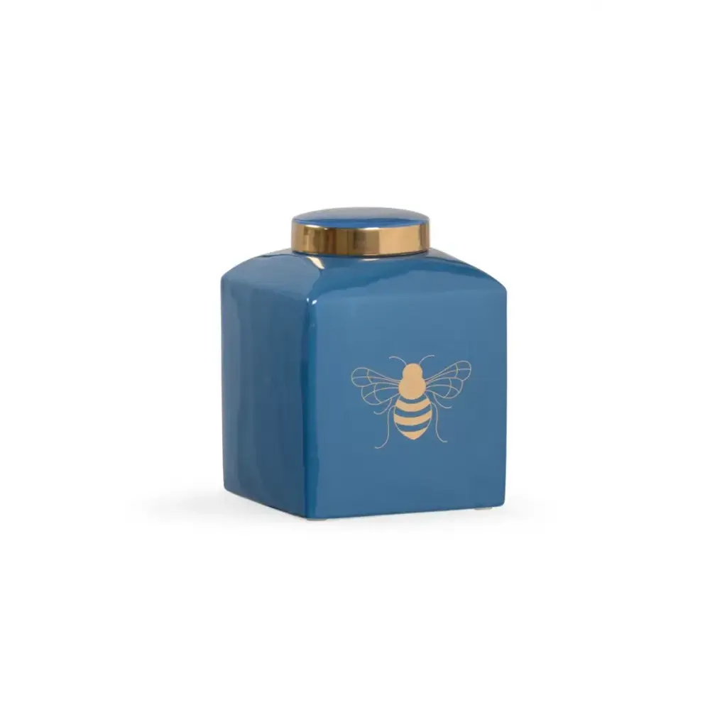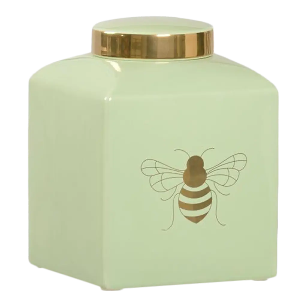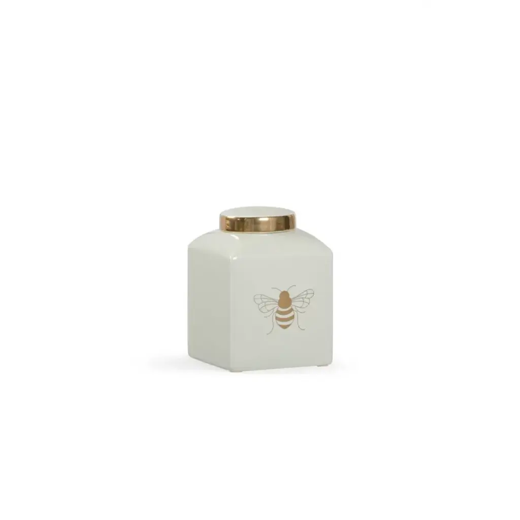 A small version of a traditional ginger jar featuring a royal bee in metallic satin gold to coordinate with the tabletop version. Available in a variety of colors. Designed by Shayla Copas.