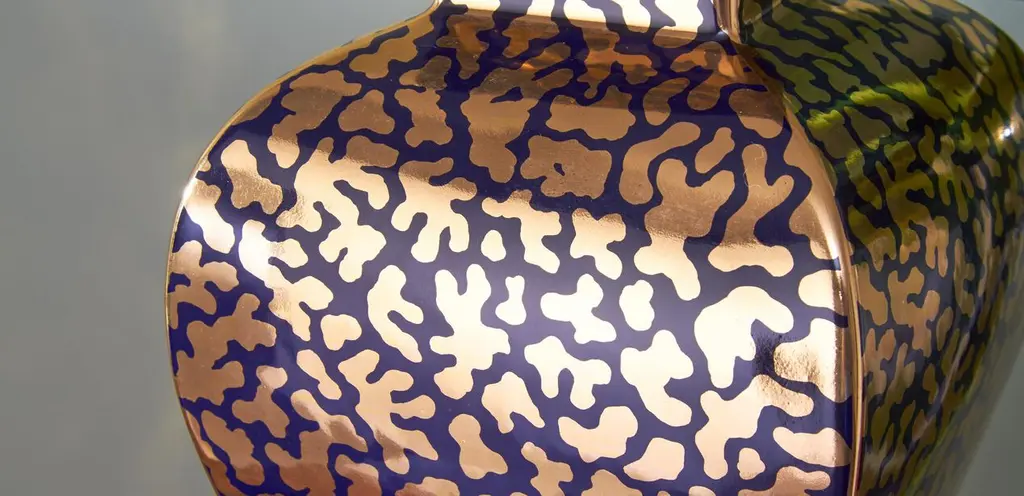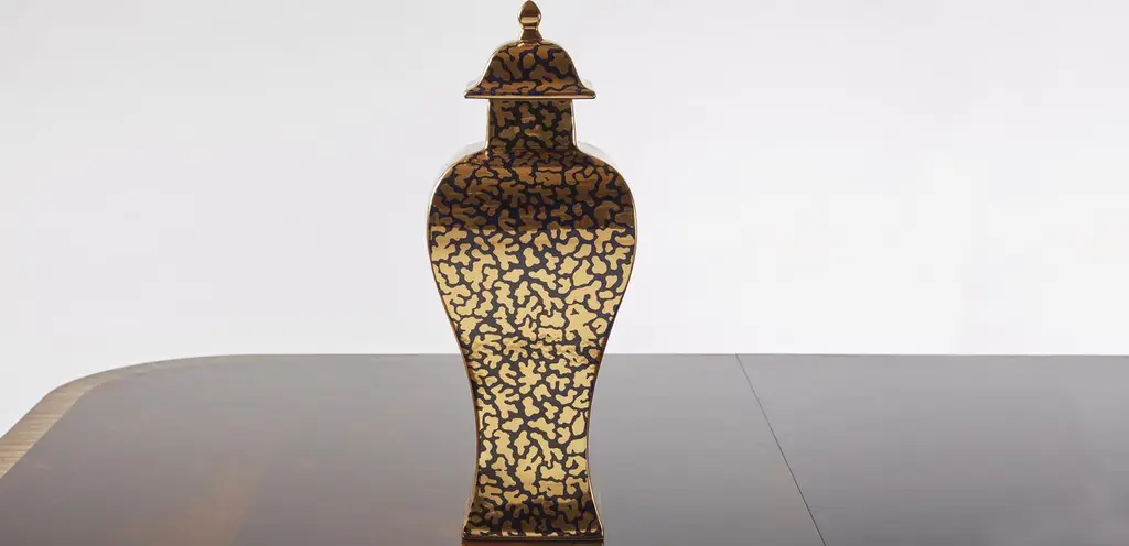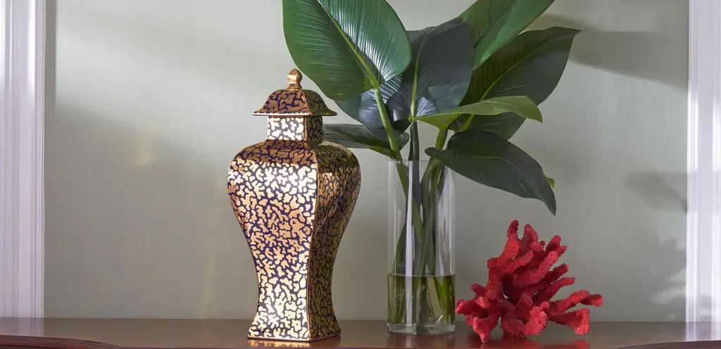 Handpainted in a luxe combination of rich navy and gold, our Blue and Gold porcelain jar has a tall, slender, pagoda-inspired profile and a modern, abstract vibe. It's crafted from the finest clay—you can feel the quality in the weight of the jar—by artisans who have passed down their firing, painting, and glazing techniques for more than a century.