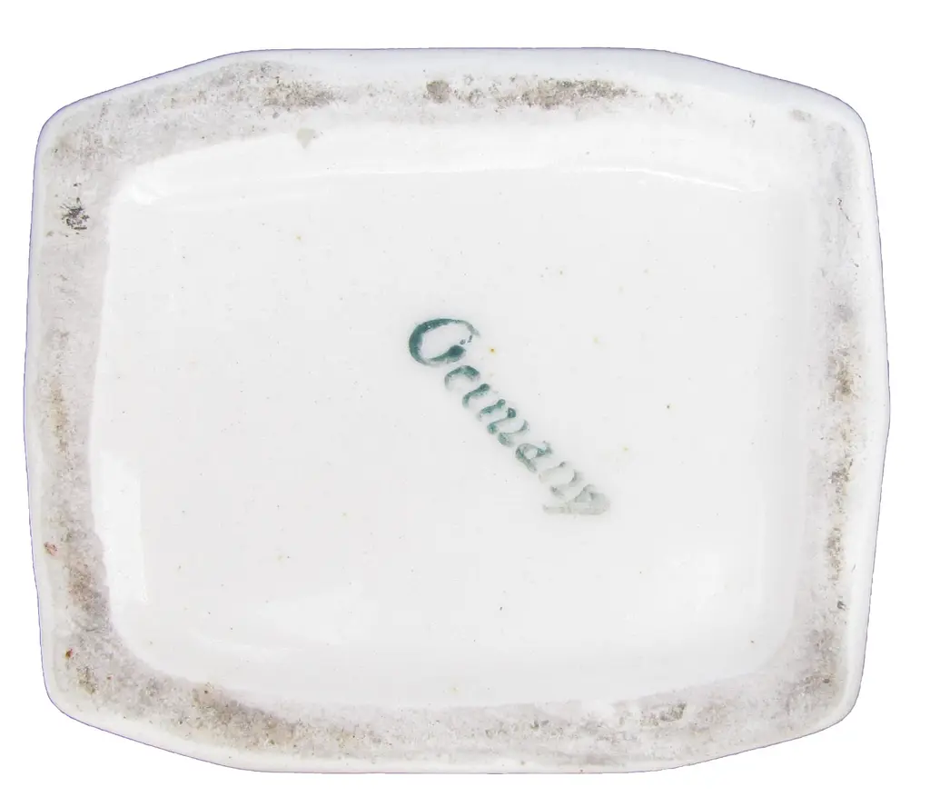 Jazzy pair of 1930s / 1940s Art Deco ironstone lidded spice canisters with fabulous graphic appeal in blue & white. Fun vessels to grow small succulents or herb plants, hold floral bouquets, or to display for their strong design aesthetic. Mark: "Germany" en verso. Overall very good condition, glaze transfer flaw and chip on underside of lid, neither of which detracts from display.