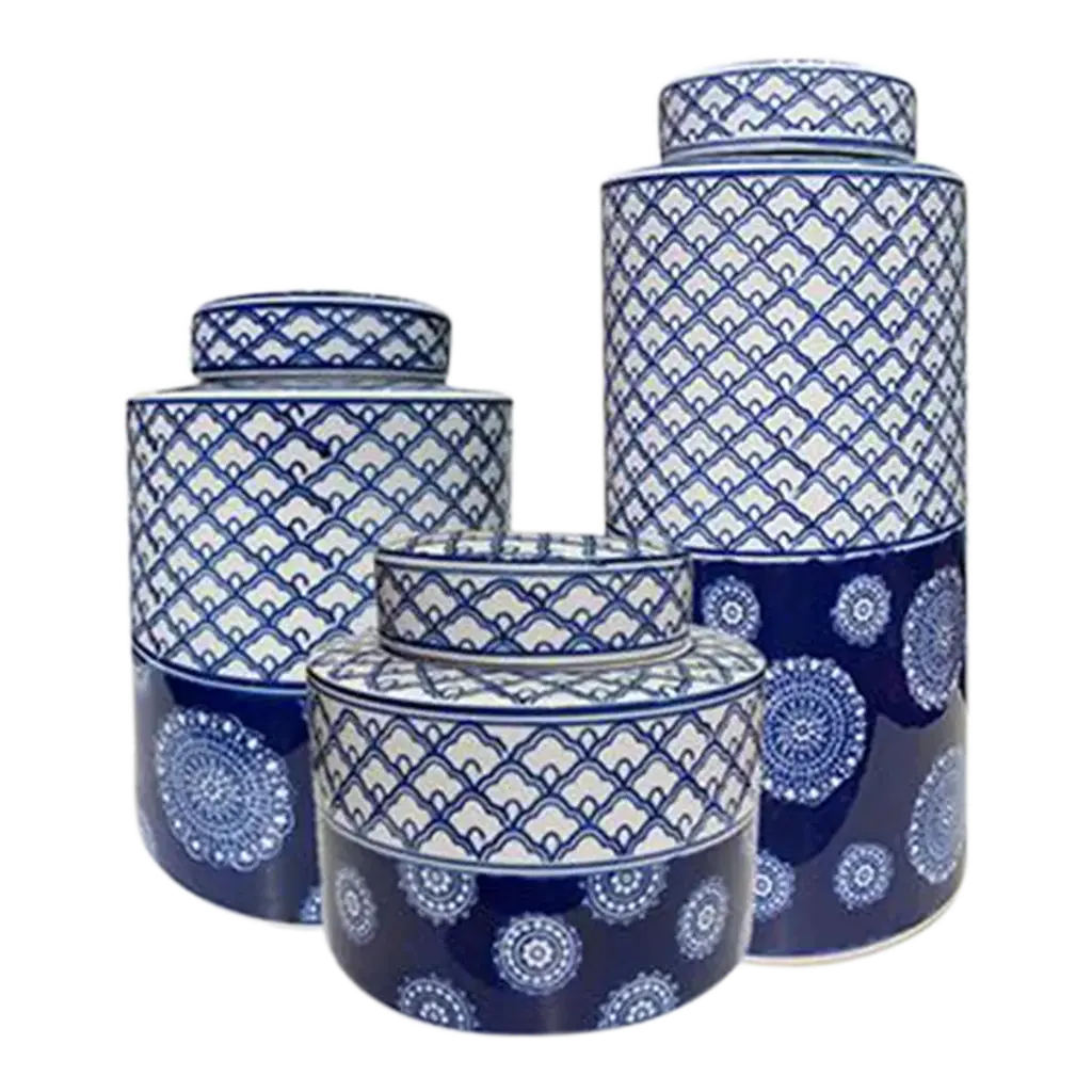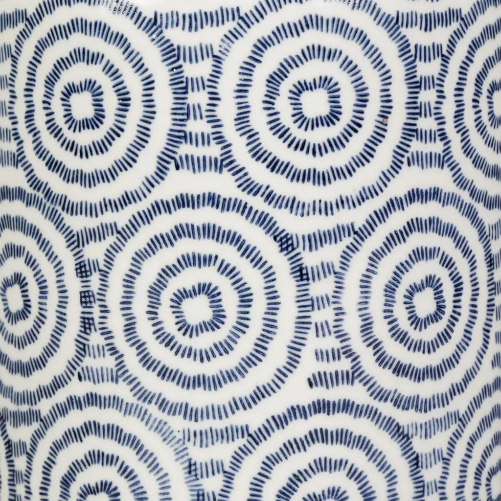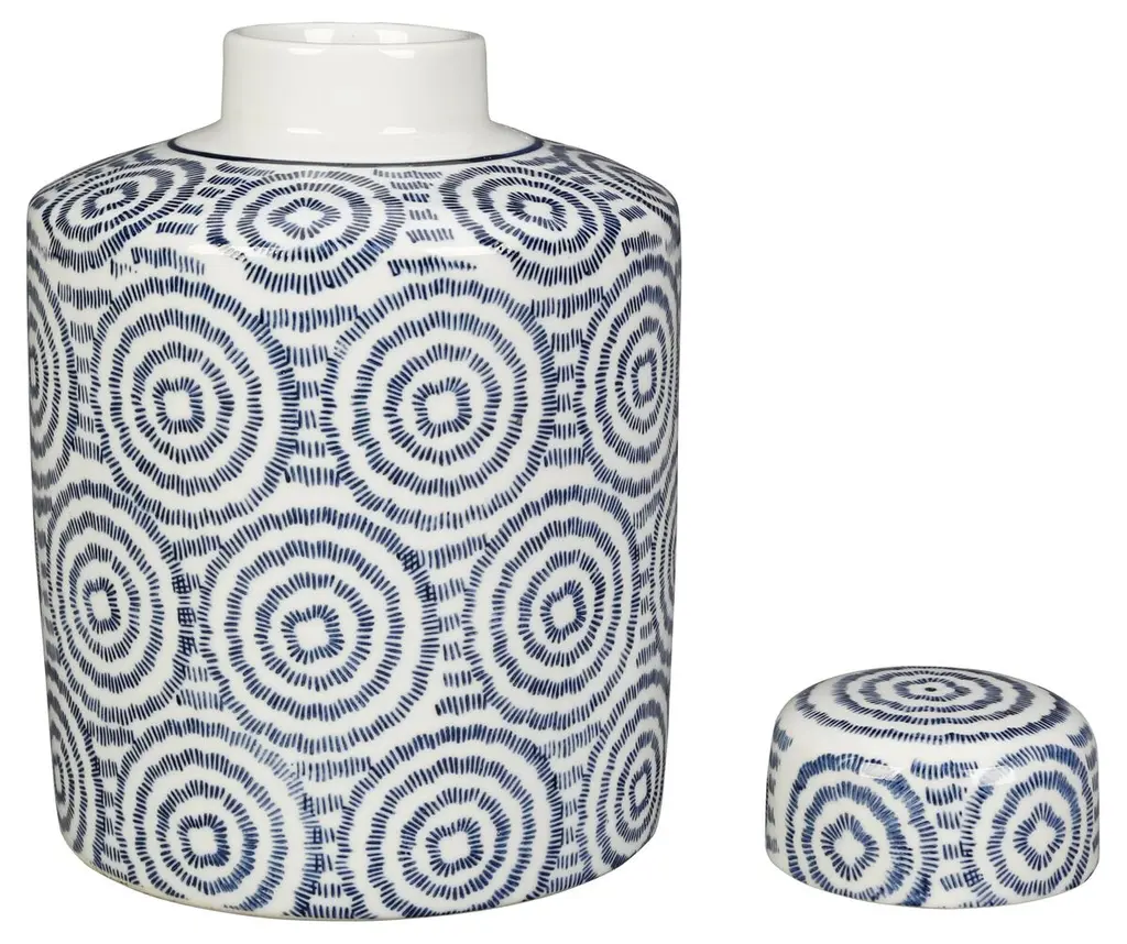 A contemporary motif of blue concentric circles gives this porcelain jar a fresh vibe without detracting from the elegance of its classic silhouette.
