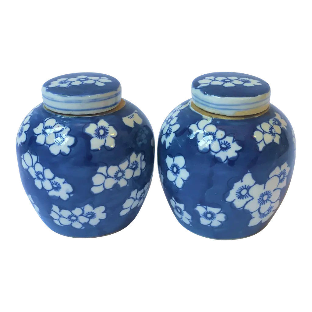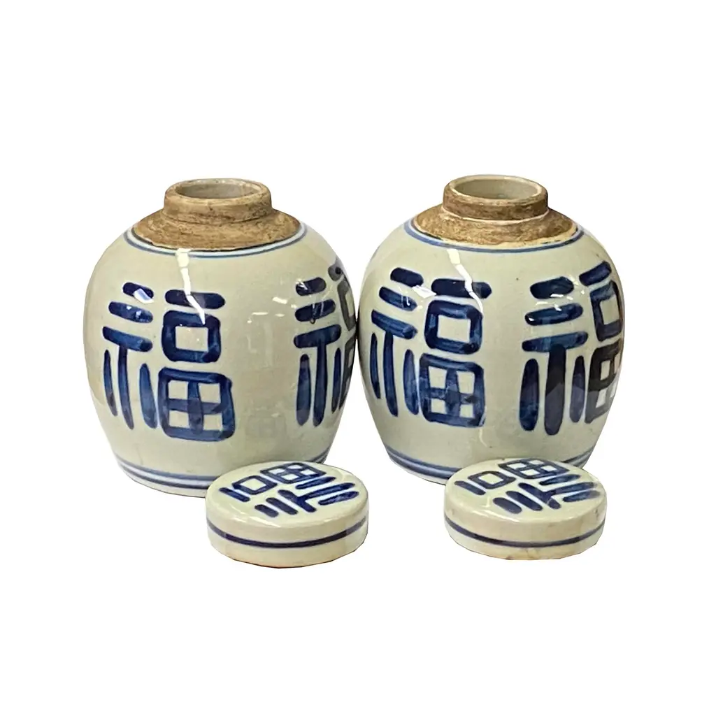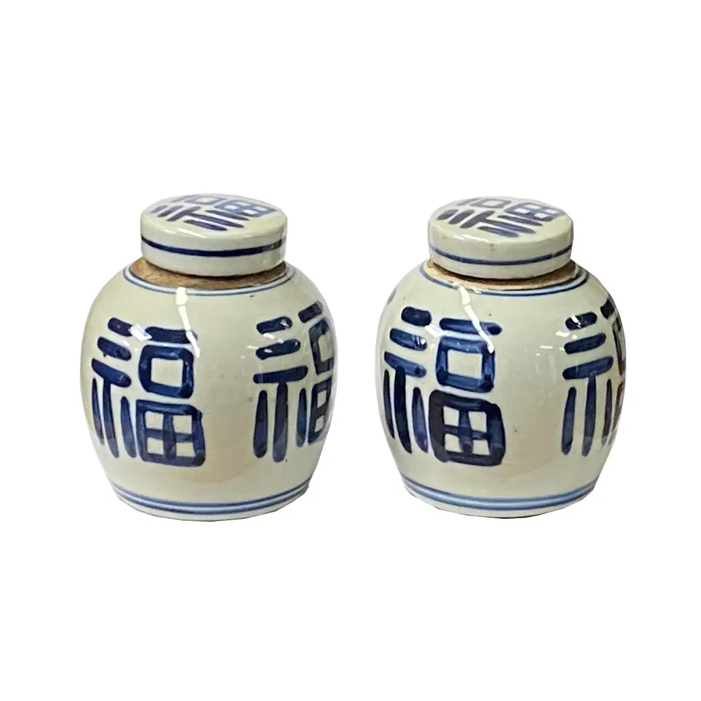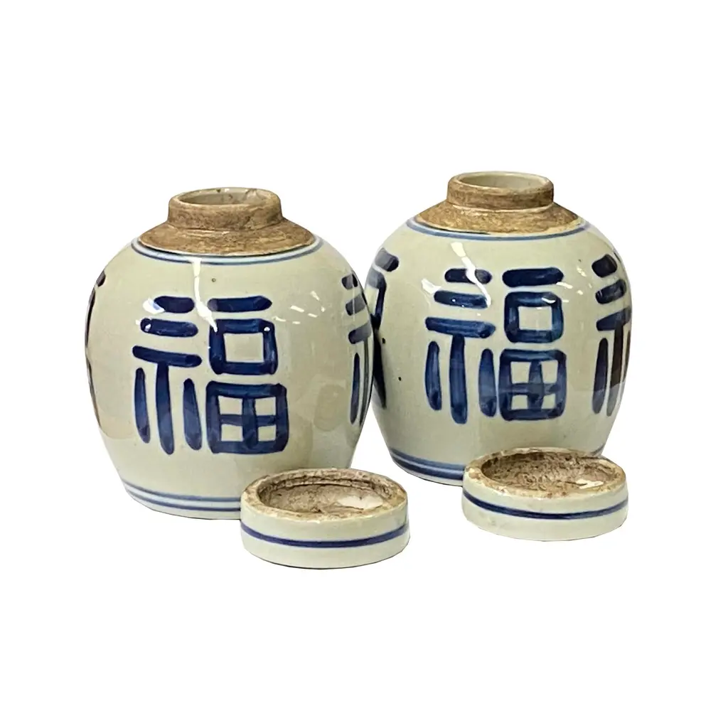 Blue White Small Oriental Fok Characters Porcelain Ginger Jars - A Pair