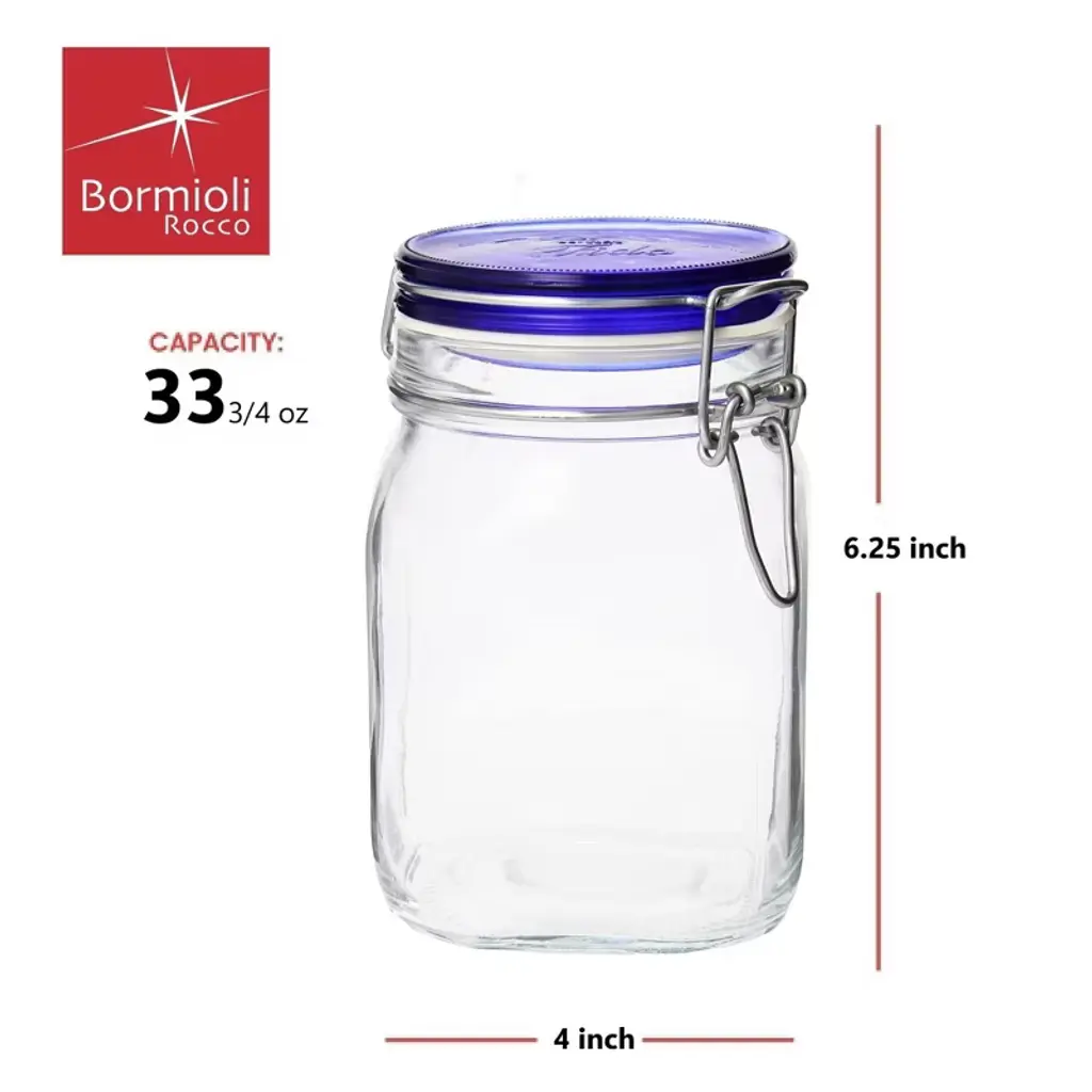 Bormioli Rocco Fido Glass Storage Jars, Blue Lids Airtight Pantry Canisters, 33.75 Oz Clamp Lock Containers, Dishwasher & Microwave Safe (Set Of 2)