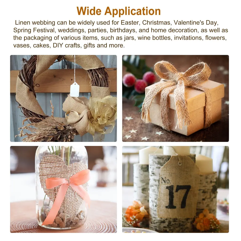 Description:Material: The burlap ribbon is made of jute material, soft and durable, tear-resistant, easy to clean and store, not easy to fade and wear, and can be reused for a long time.Edge Sealing Design: The burlap ribbon adopts a unique line edge sealing design, which is not easy to deform and tear. Burlap webbing is easy to fold and bend to meet different decorative shapes. Give the gift a retro and warm feeling.Flexible to Use: These wrapping ribbons are soft, easy to handle, and highly flexible, allowing you to make different forms of decoration and binding according to your preference. The ribbon can be cut and the length is adjustable. You can choose the length according to your needs.Wide Application: Linen webbing can be widely used for Easter, Christmas, Valentine's Day, Spring Festival, weddings, parties, birthdays, and home decoration, as well as the packaging of various items, such as jars, wine bottles, invitations, flowers, vases, cakes, DIY crafts, gifts and more. Specification:Color: Jute ColorMaterial: BurlapWidth: 25mm / 0.98 InchTotal Length: 25m / 27YardsPackage Content: 1pcs x Burlap Ribbon