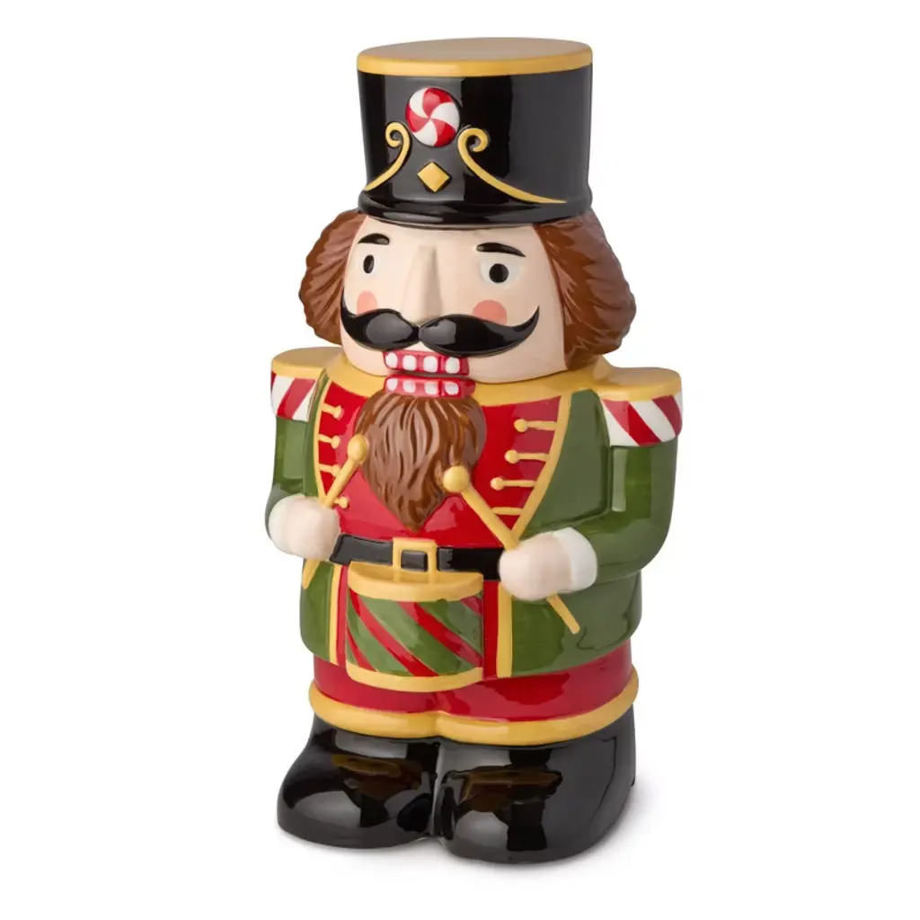 Bring whimsical cheer to your kitchen this holiday season with the Nutcracker Parade Holiday Cookie Jar. Crafted from durable ceramic and featuring a vibrant, hand-painted-style 3D nutcracker drummer design, this festive jar is both functional and decorative. The generous 56 oz capacity provides ample space for Christmas cookies, candies, or seasonal snacks, making it a perfect addition to any holiday baking station or gift table. This eye-catching piece doubles as a charming holiday decoration for your countertop, mantel, or sideboard. Whether you’re gifting a holiday host or treating your family, this cookie jar adds a dash of nostalgic holiday magic to your kitchen décor.