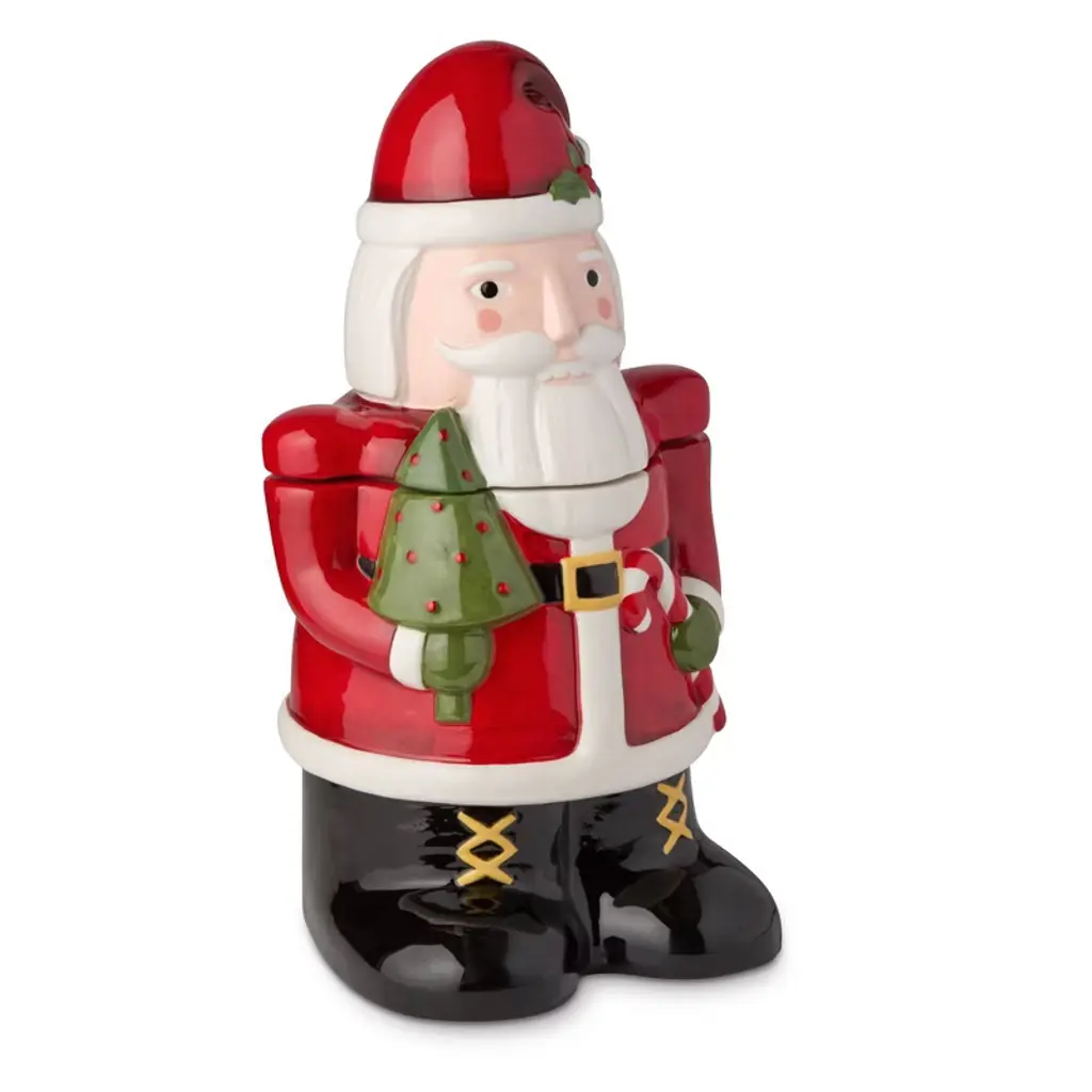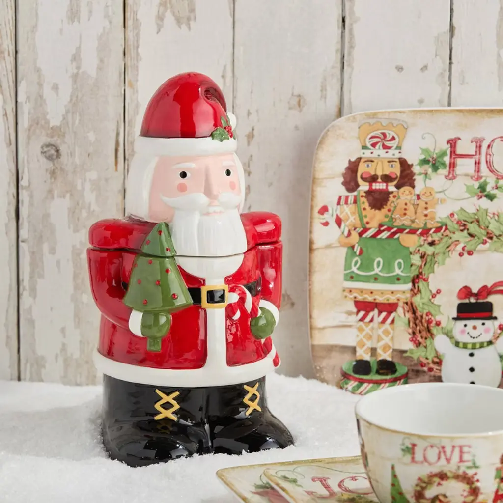 Celebrate the sweetness of the season with the Nutcracker Parade Santa Cookie Jar, a festive ceramic jar that’s as charming as it is functional. This 3D Santa Claus is beautifully sculpted and hand-painted in vibrant holiday hues, holding a miniature Christmas tree and candy cane in his gloved hands. With nostalgic details and timeless cheer, this piece brings whimsical warmth to any kitchen or holiday display. Designed to keep cookies and treats fresh, it features a removable lid with a snug fit, making it ideal for storing everything from homemade goodies to wrapped candy canes. Its vintage-inspired design pairs perfectly with our Nutcracker Parade dinnerware collection, creating a coordinated holiday theme filled with color, character, and heart. Whether you're gifting it or making it the centerpiece of your Christmas kitchen, this collectible cookie jar delivers joy, nostalgia, and practical beauty that lasts for generations.