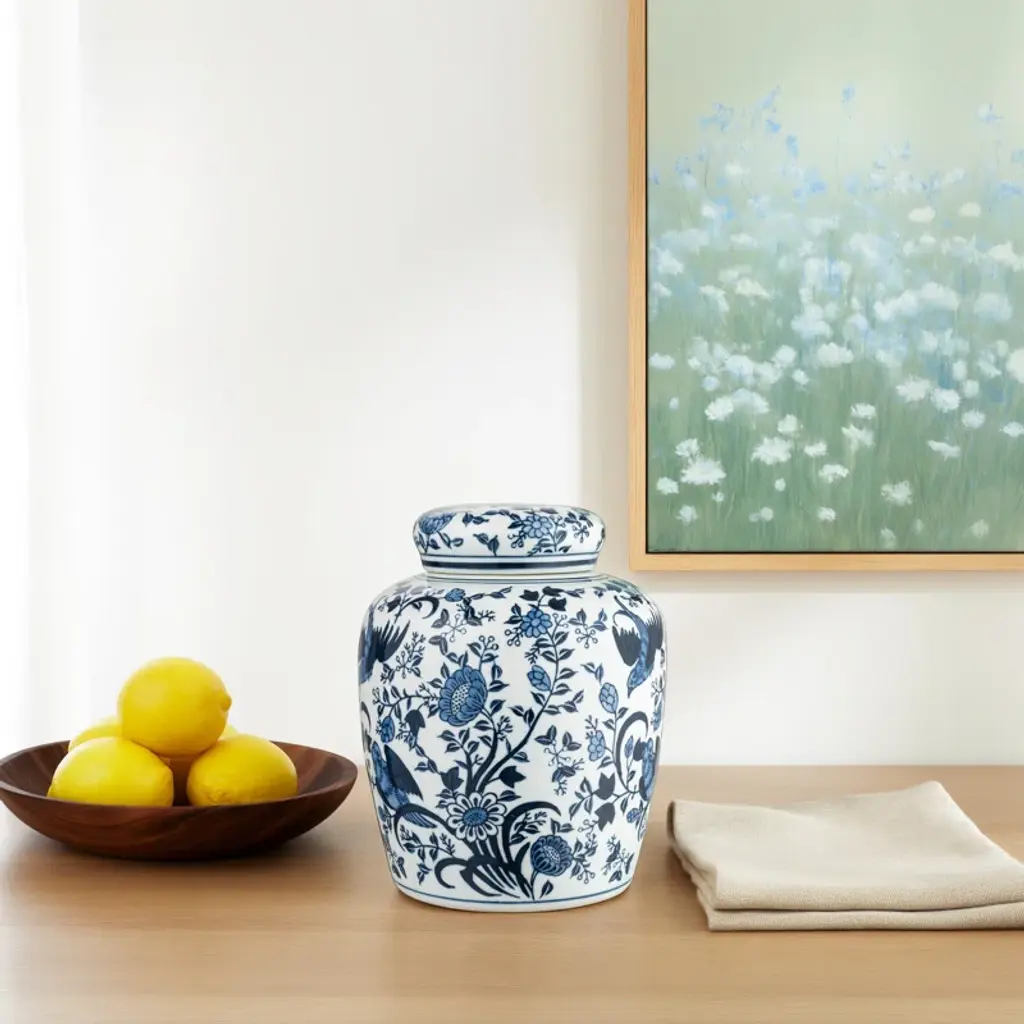 This blue and white ceramic ginger jar with a removable lid is a beautiful piece to enhance any home décor. This ginger jar has a classic shape and a floral pattern, giving it a simple and elegant look. The jar and the lid are made of high-quality ceramic with a glazed finish that gives it a smooth and shiny appearance. The jar and lid have a blue and white color scheme, creating contrast and harmony in any space. This ginger jar is a decorative piece that stores and displays various items such as candy, cookies, tea, or spices. It can be placed on a kitchen counter, dining table, mantel, or shelf to add charm and style to any space. This ginger jar can complement any Asian, traditional, or coastal-style home décor with its cultural, elegant, and soothing vibe. This ginger jar is a perfect size for any space, measuring 6.25 inches round and 8.25 inches high. The lid is removable. Order this today and enjoy a stylish and practical addition to any home.