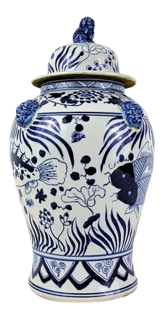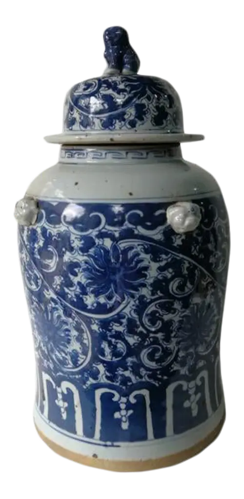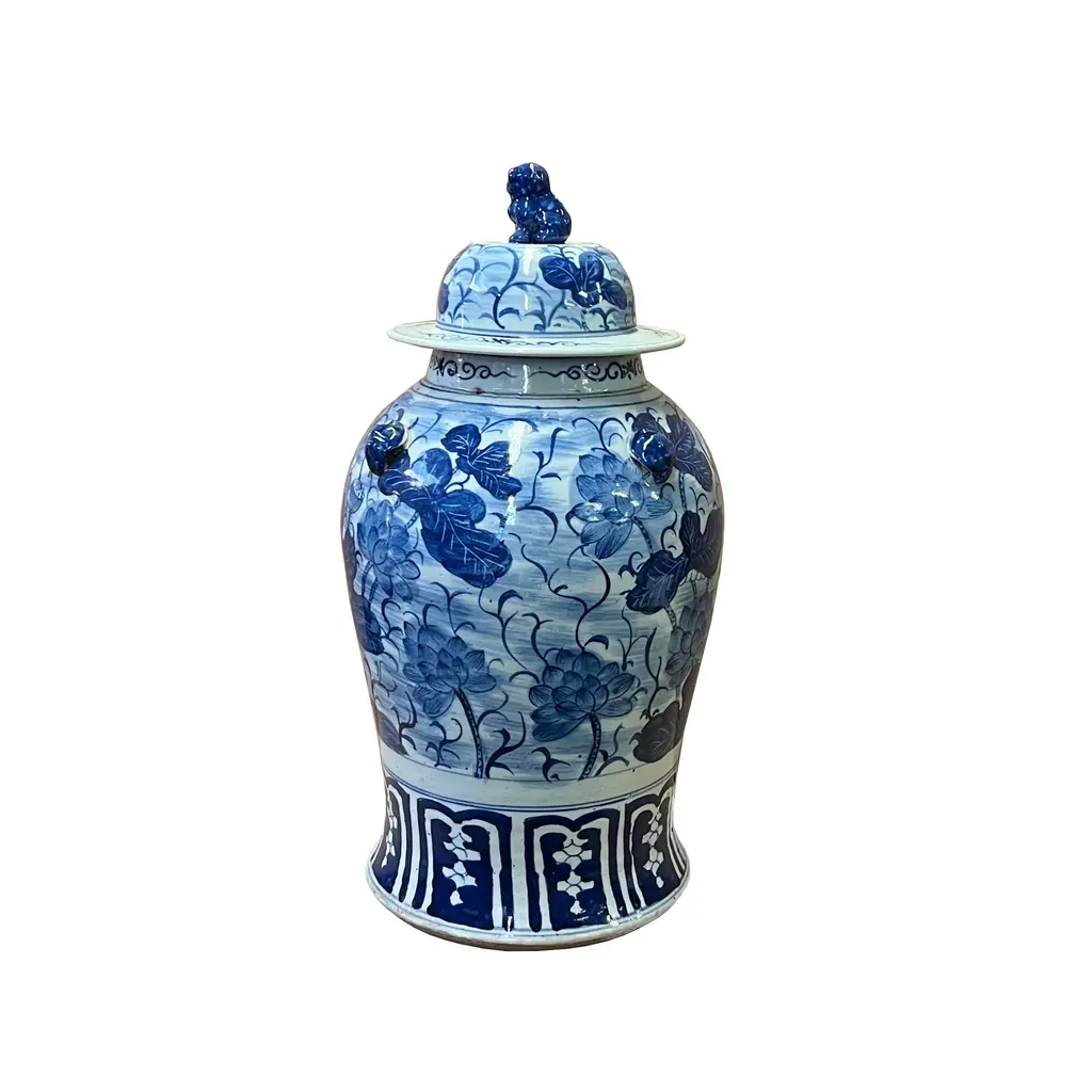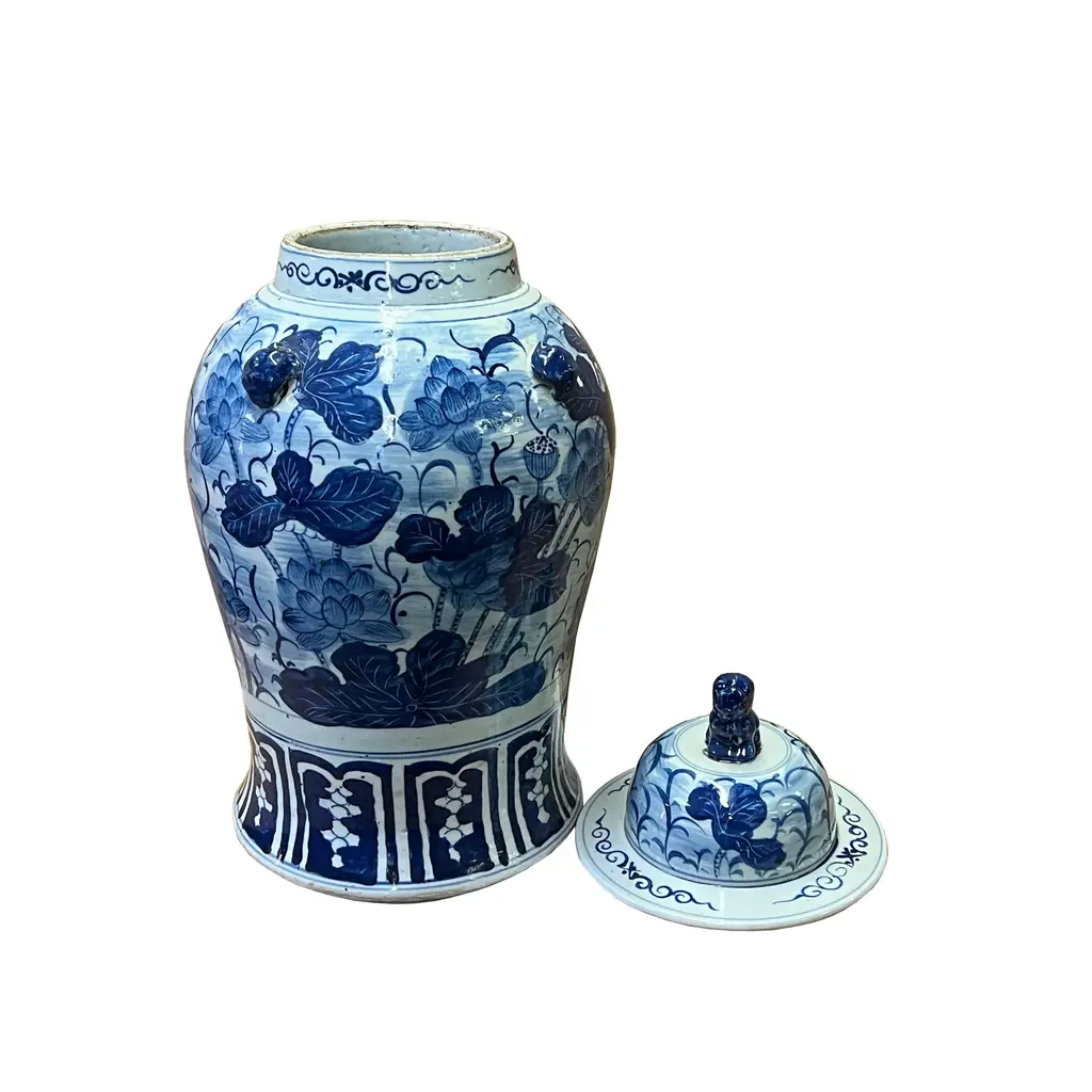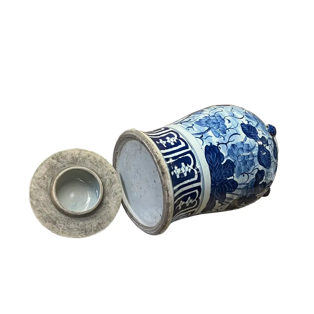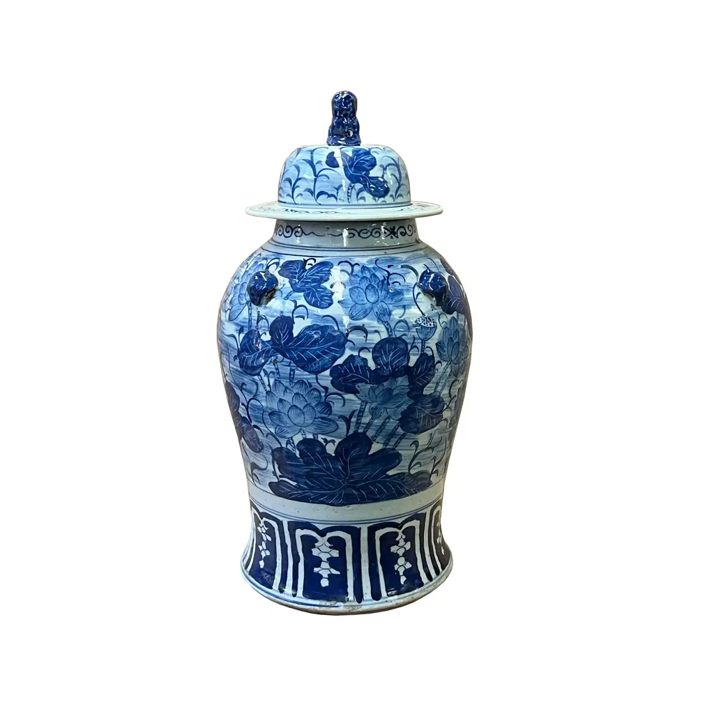 Chinese Blue & White Lotus Flower Porcelain Large Temple General Jar
