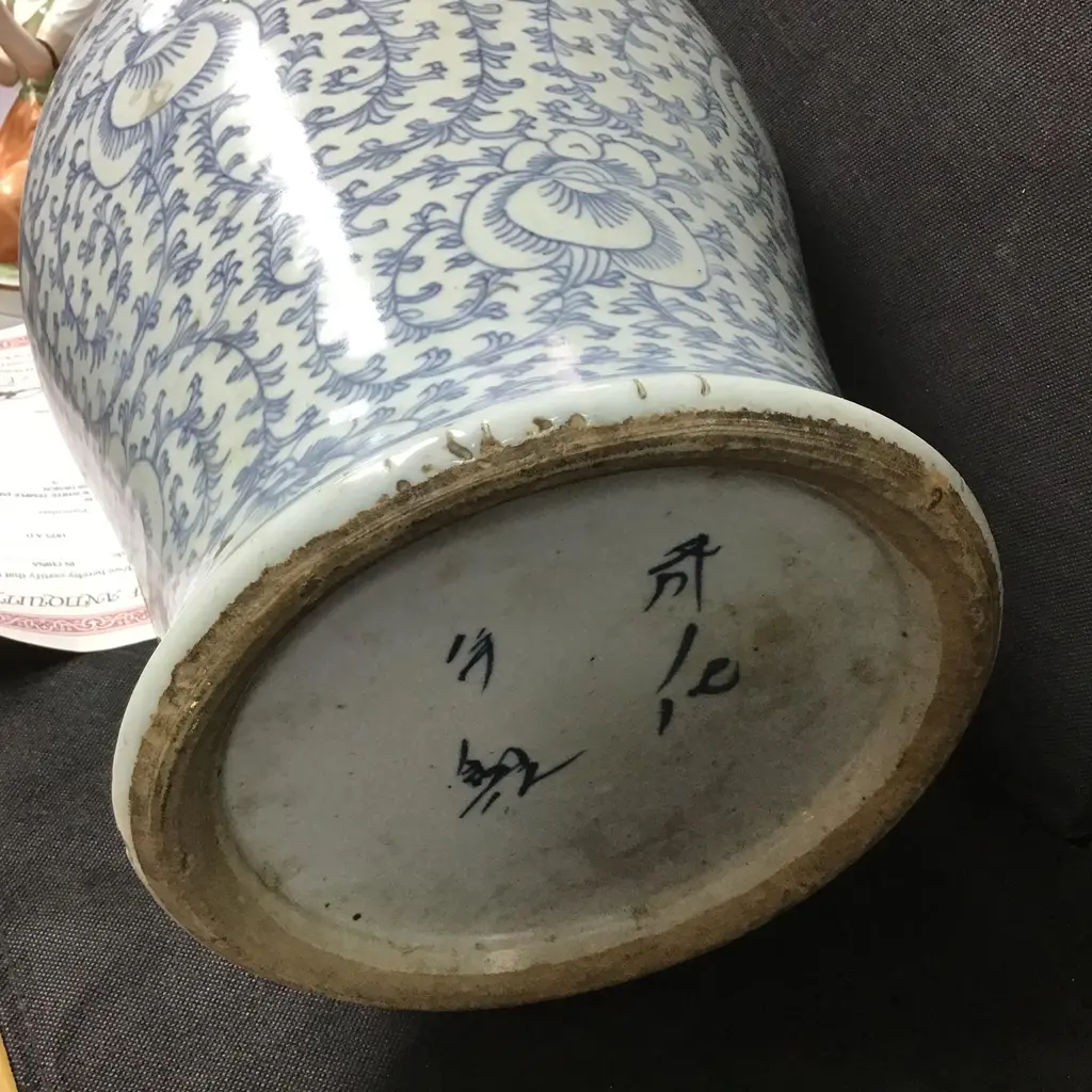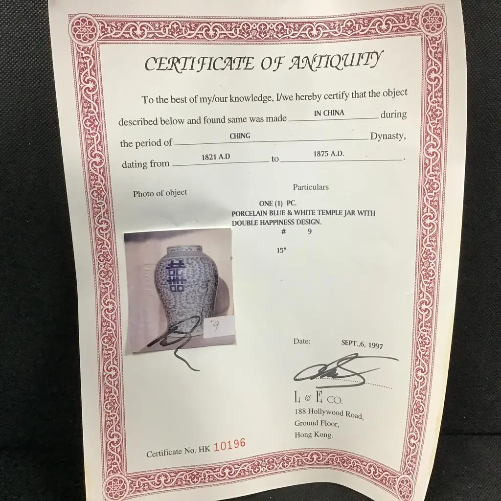 This blue-and-white temple jar stands tall with broad shoulders that taper to a splayed base. Bordered by a simple meander at the neck, the jar is decorated with a dense pattern of orchid blossoms and trailing vines. On each side of the jar, the intricate decorations swirl around a central "double happiness" character, a traditional symbol of marriage and conjugal bliss. Bought in China in the 1990s and includes certificate of authenticity. Price is for one Temple Jar. Two available.