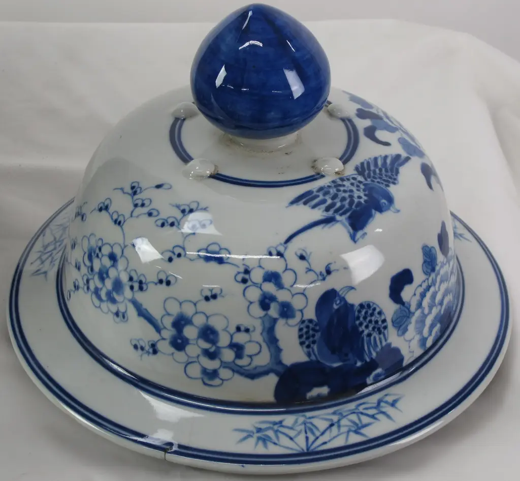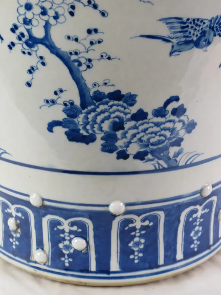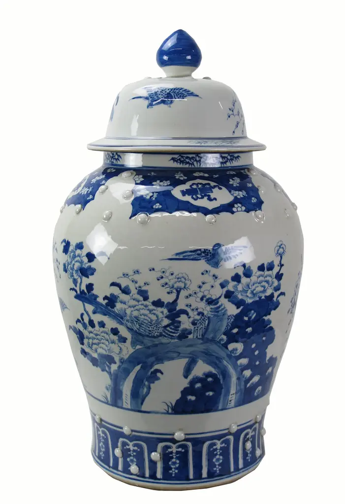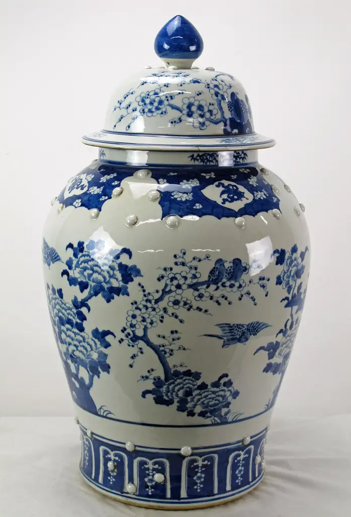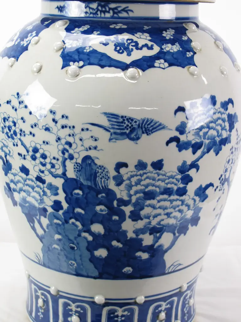This gorgeous large blue and white porcelain jar is adorned with beautifully hand painted peonies, red plum and lovely flying birds. Antiquing process applied gives this beautiful ginger jar a true antique look. It will be a magnificent pair in a large living room, dining room, hall way or business or hotel lobby. Item No.: Dimension: 15.3"W, 15.3"D, 27"H Circa: Antique Reproduction Material: Porcelain Feature: Handmade & hand painted. Each piece has natural variance & imperfection.