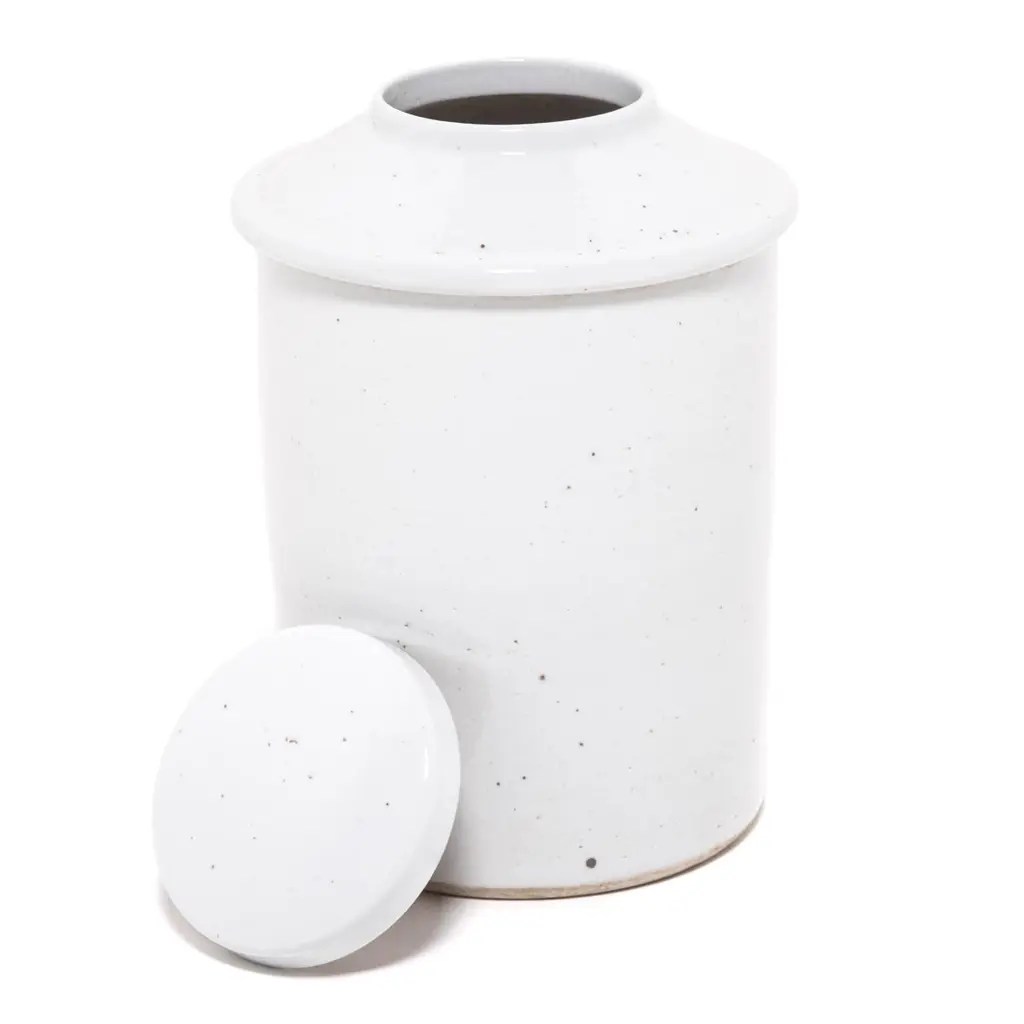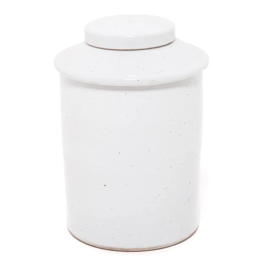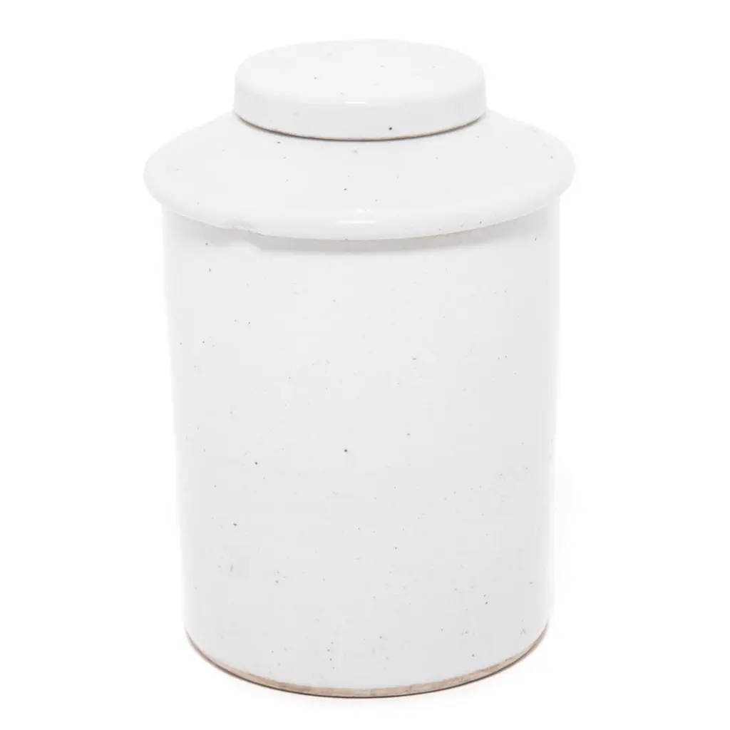 Rendered in a striking white glaze, this contemporary porcelain jar offers a modern take on a Classic form. Lidded jars like these were used in tea shops in China, where tea drinking was a symbol of taste and upper-class refinement.Additional Dimensions: Diameter of Lid: 6.25"Diameter of Opening: 4.75"
