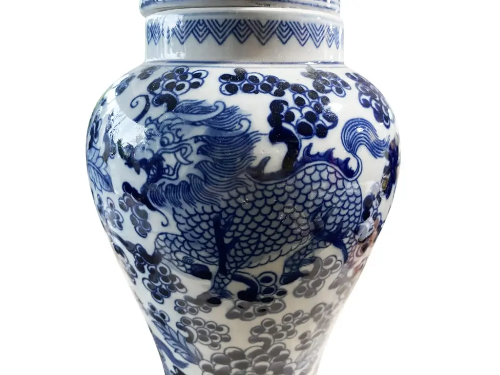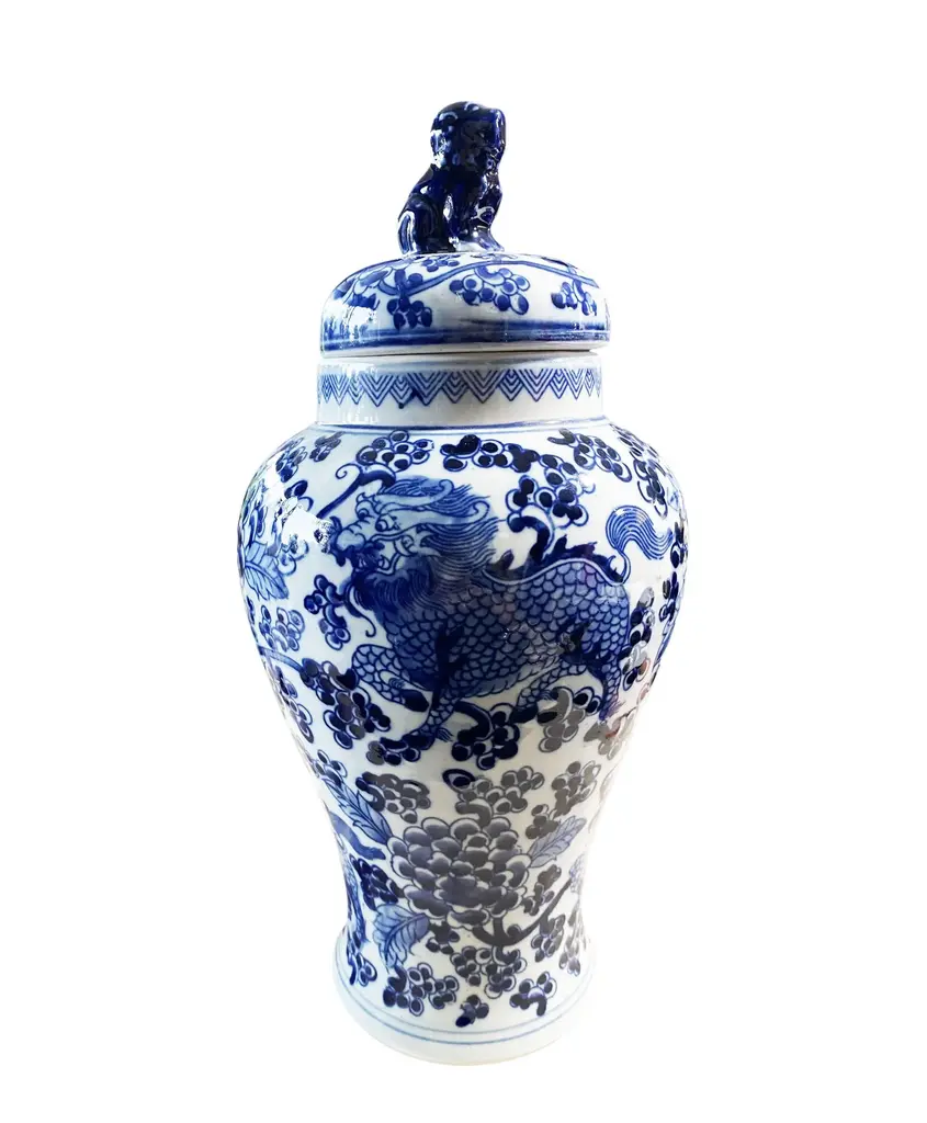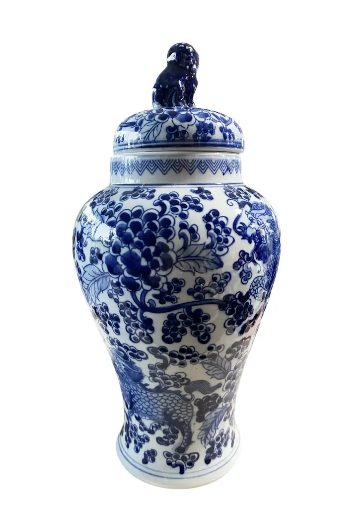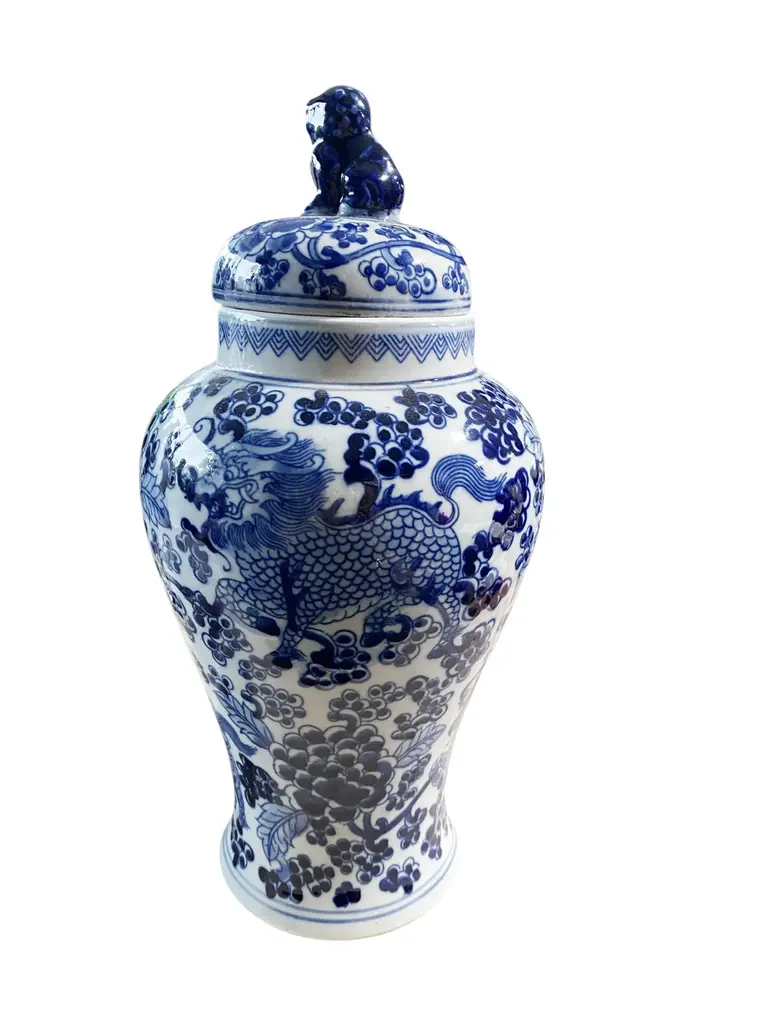 Chinoiserie Blue And White Porcelain Covered Jar 13" H