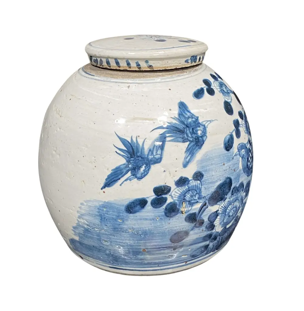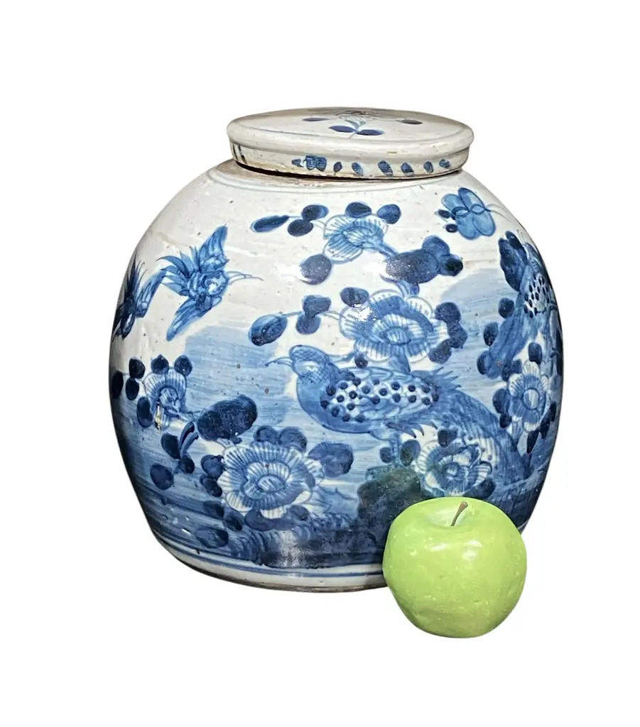 Superb porcelain ginger jar hand-painted with flying birds and peonies flowers In Ancient Chinese the appearance of the bird signals the start of a new, prosperous era. In feng shui, is a symbol of luck. When used correctly, the creature is said to bring auspicious chi both to your life and home. 10" W x 10" H.