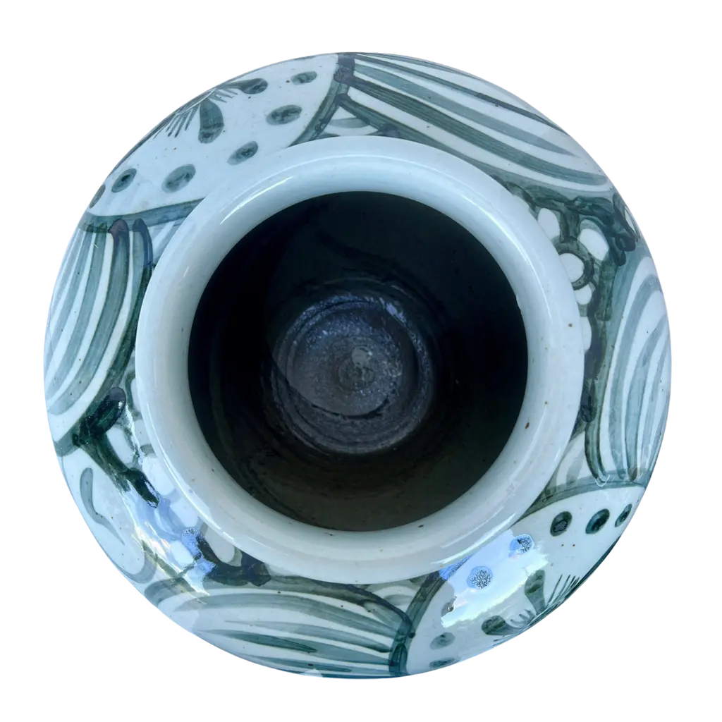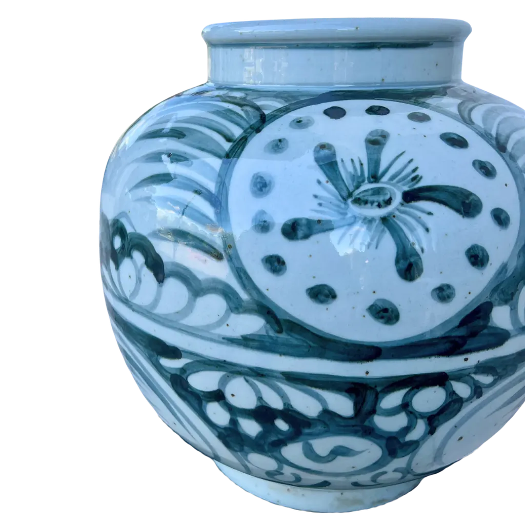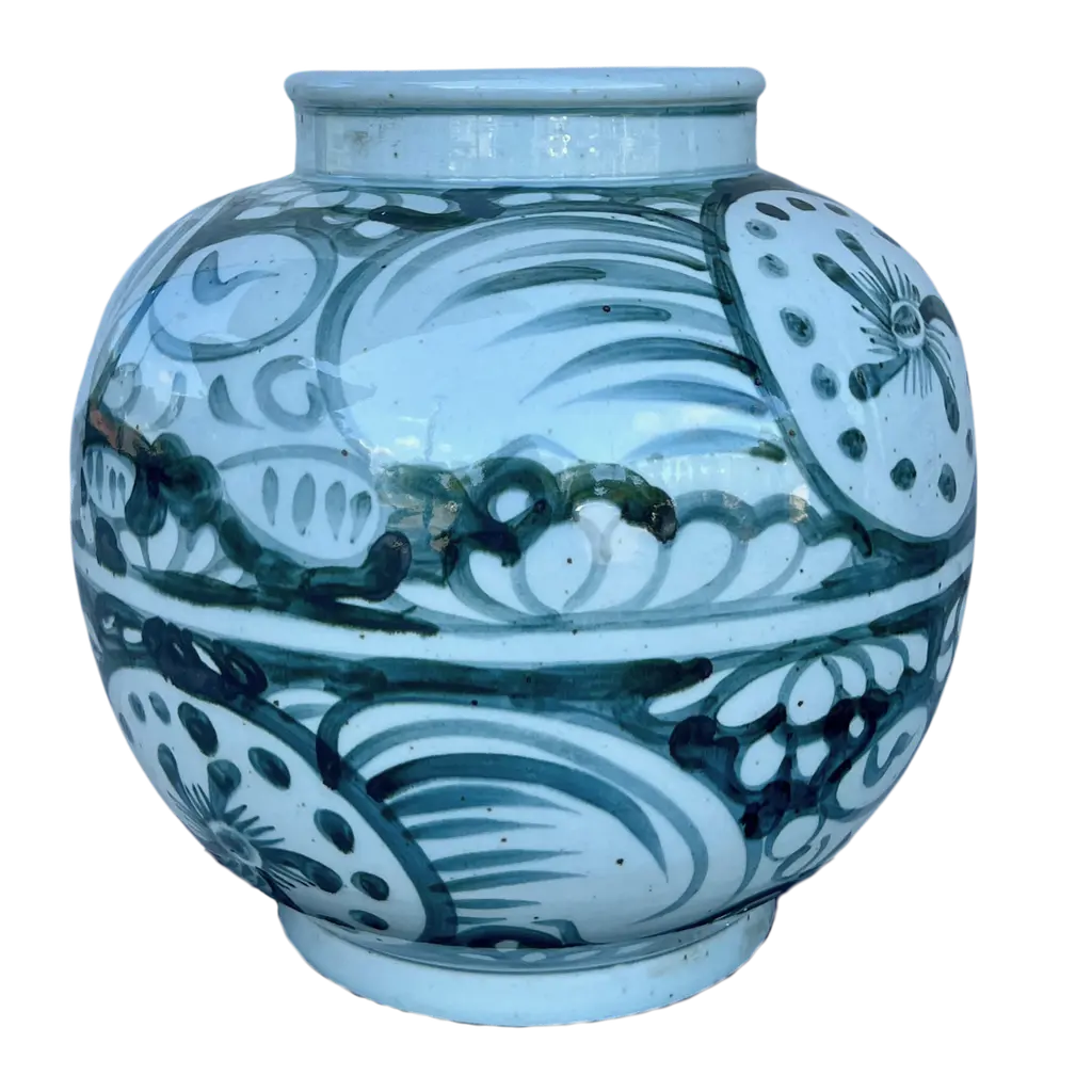 Bold and sculptural, this hand-painted blue and white jar features a stylized sunflower motif framed by sweeping scrollwork and organic patterns. Its generous size makes it a standout anchor on a console, island, or large tabletop display. 2 available. Dimensions: approx. 15” W x 15” D x 15” H Maker unknown, no identifying marks.