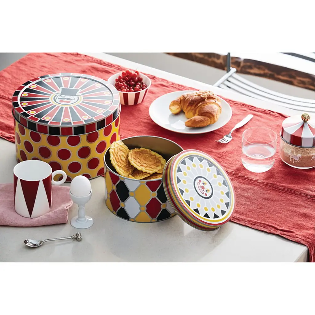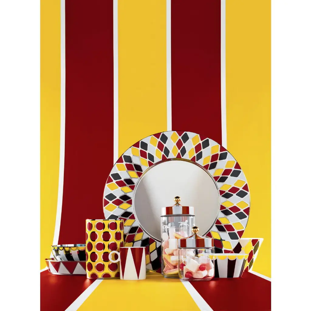 Alessi’s Circus glass jars are decorated with white carousel horses. The red and white tinplate lid features a sealing ring and a golden knob. The jars are available in different sizes. Circus is a playful kitchen and serving collection designed by Marcel Wanders for the Italian design brand Alessi. The collection was inspired by the ambience of old, colorful circus tents, where bright shades of yellow and red combine with strong black and white patterns and the shine of gold and silver. The Circus collection transforms the delightful spirit of old-time circus into a modern shape and fills the table with joyful atmosphere.