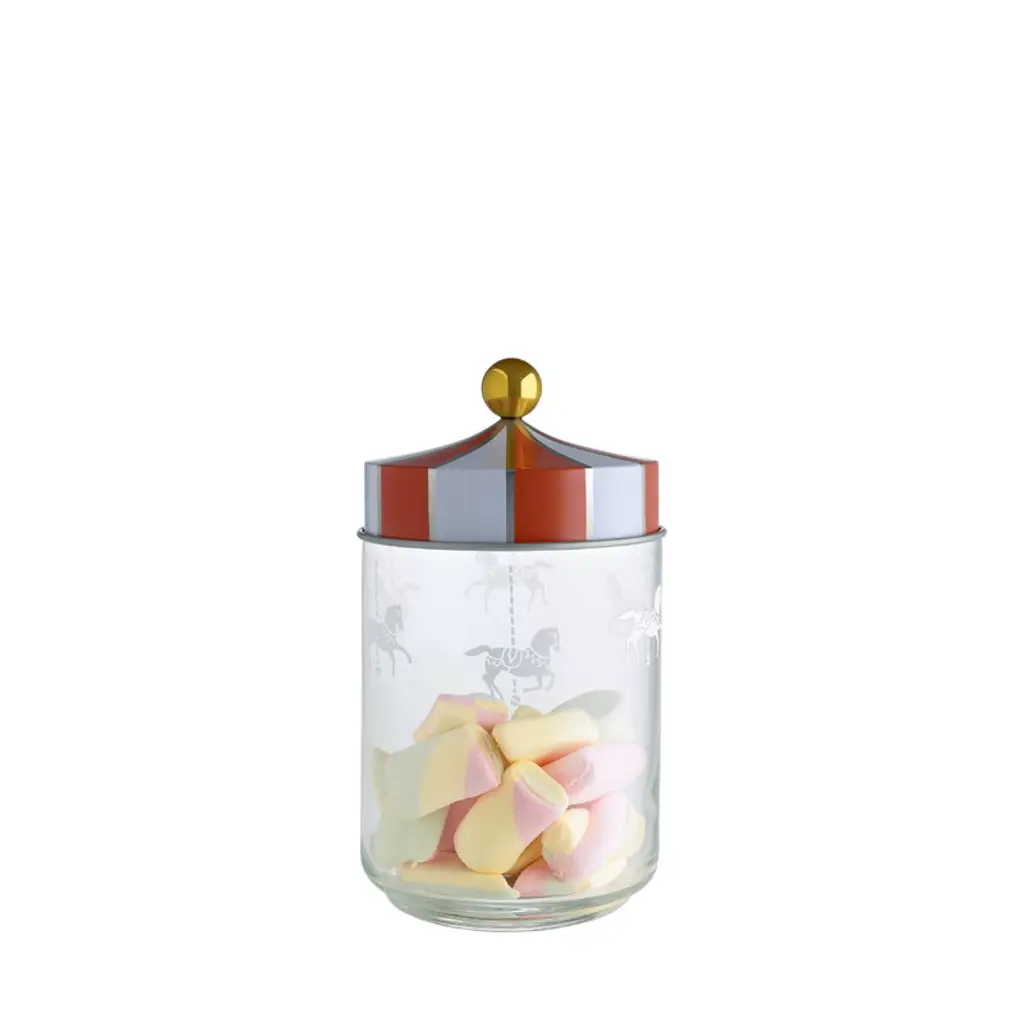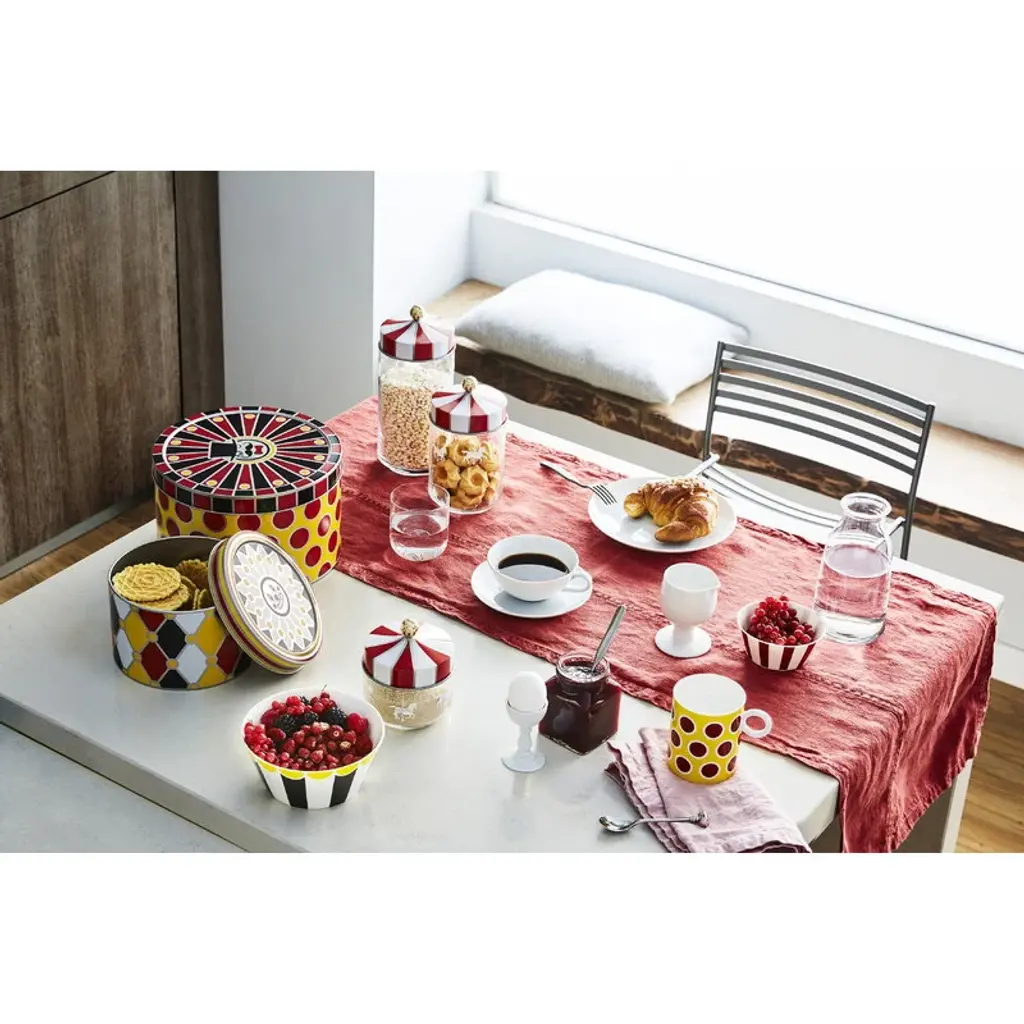 Alessi’s Circus glass jars are decorated with white carousel horses. The red and white tinplate lid features a sealing ring and a golden knob. The canisters are available in different sizes. Circus is a playful kitchen and serving collection designed by Marcel Wanders for the Italian design brand Alessi. The collection was inspired by the ambience of old, colorful circus tents, where bright shades of yellow and red combine with strong black and white patterns and the shine of gold and silver. The Circus collection transforms the delightful spirit of old-time circus into a modern shape and fills the table with joyful atmosphere.