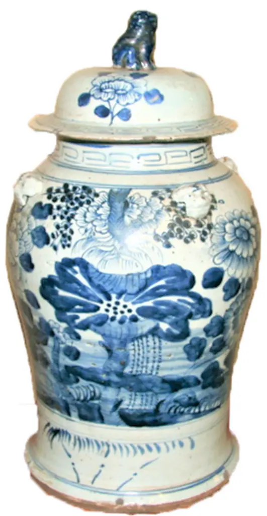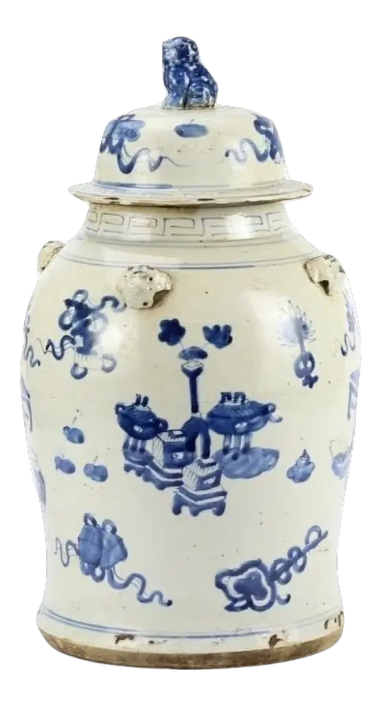 This is an extra large, high quality porcelain blue and white Balaster Temple Jar / Ginger Jar decorated with a large floral pattern. This is considered a foot stomp process on the porcelain, which gives it the rich Indigo and bone patina. This is a great decorative Ginger Jar and the color and design are incredible. It in a balaster shape with a heavy lid that comes topped with a large decorative foo dog. Additionally, it has some foo dog face handles around the top upper edge. This makes it possible to strong a tassel through to tie in the front. This would looks amazing with your other blue and white pottery / ceramics. This can be used anywhere as a jar accent or a vase. Selling individual, but have a few if you need a pair. There are newly made, but with Rough Hewen surface.