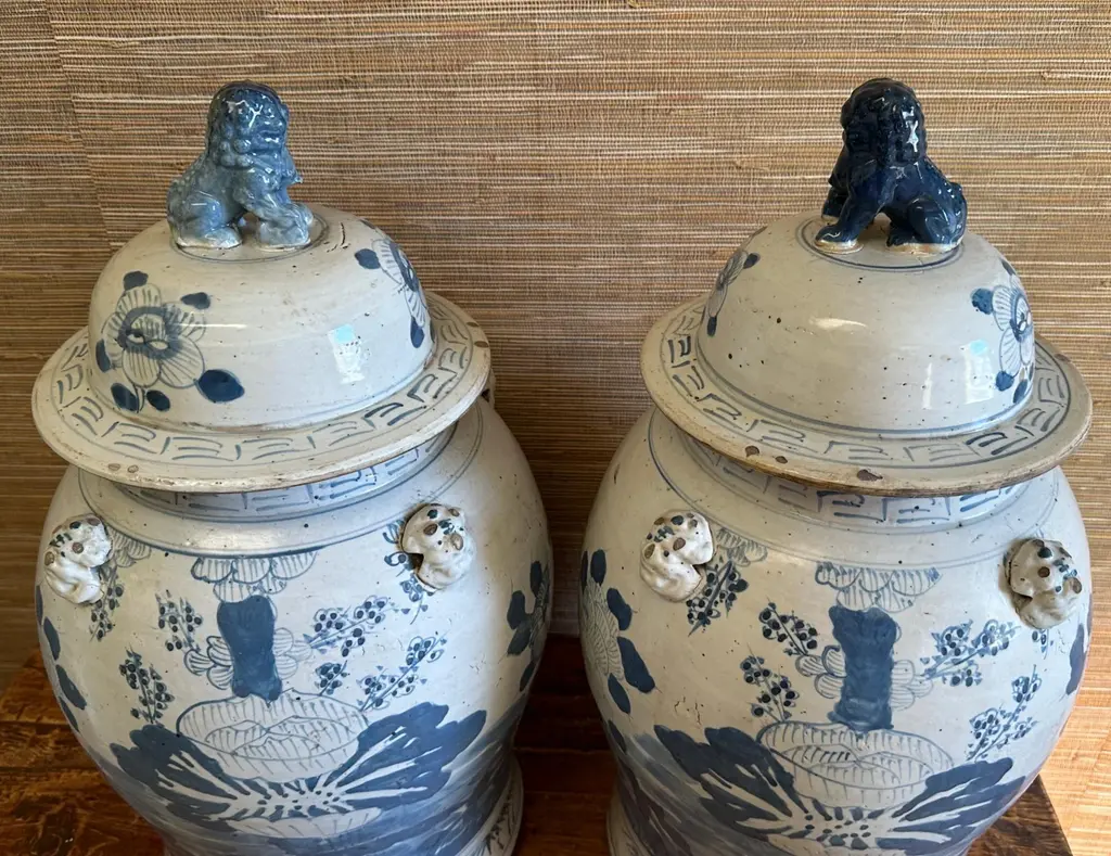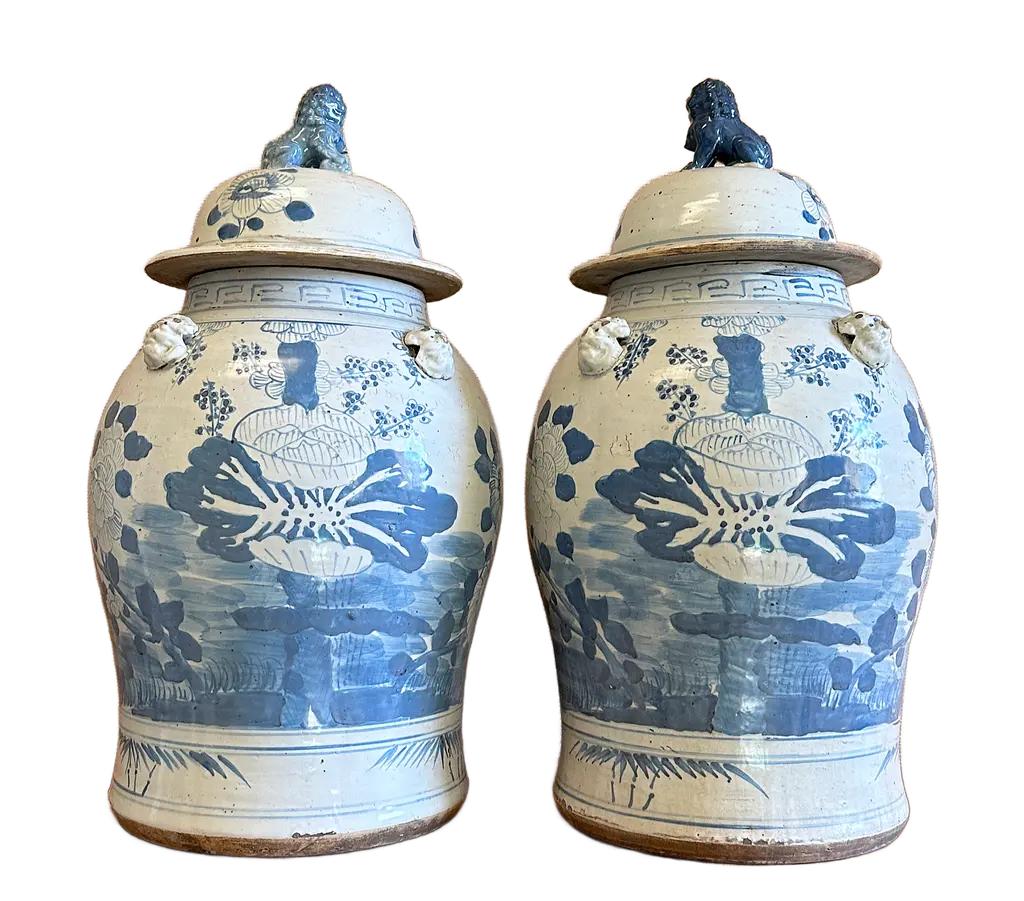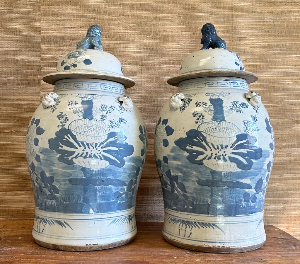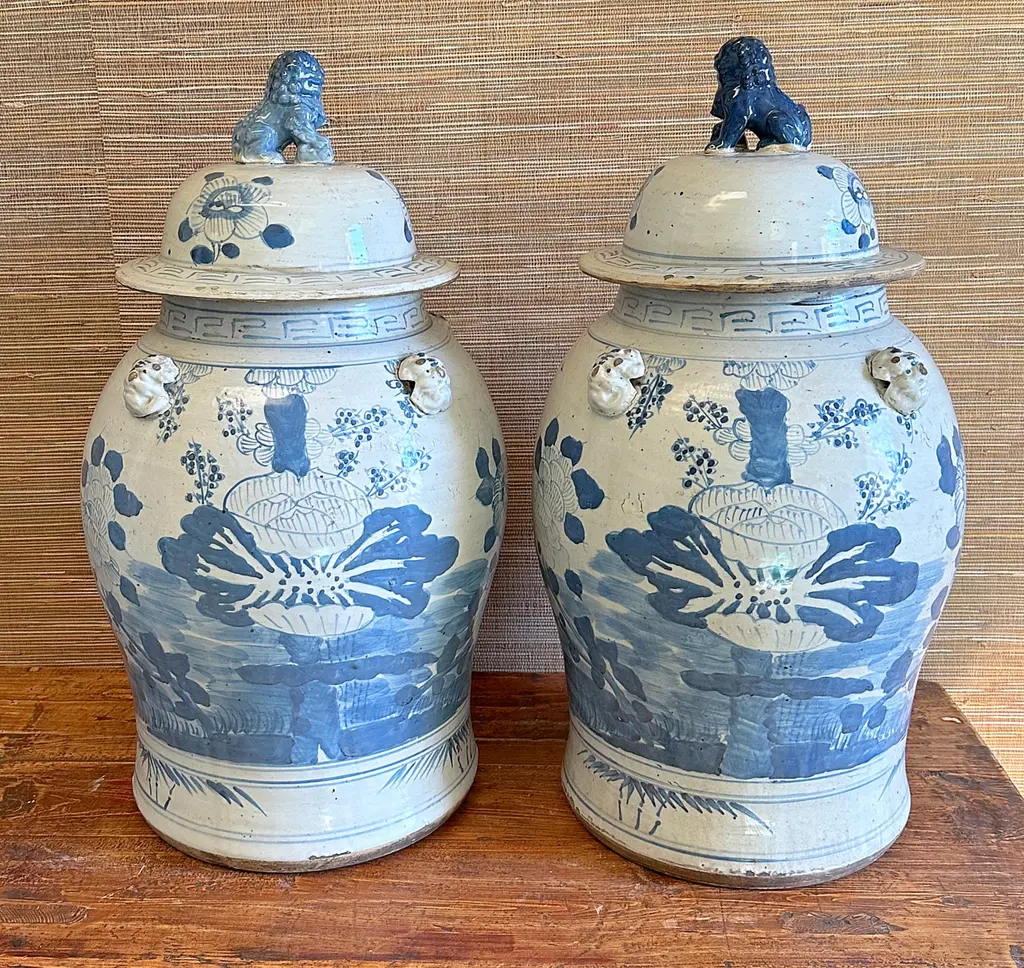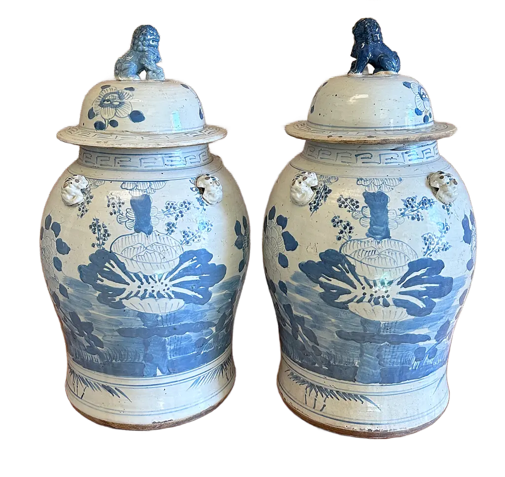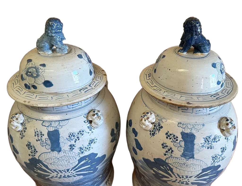 Contemporary Chinoiserie Botanical Temple Jars - A Pair