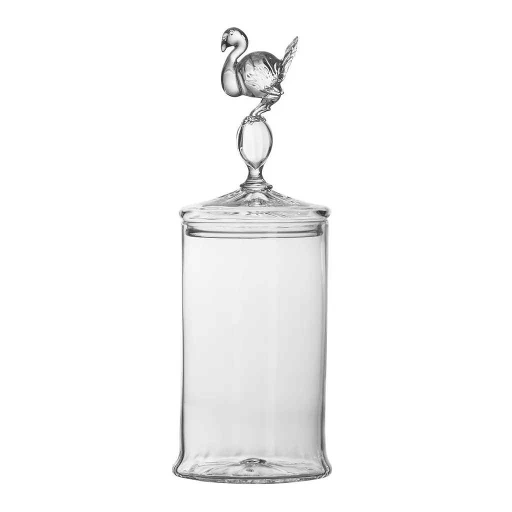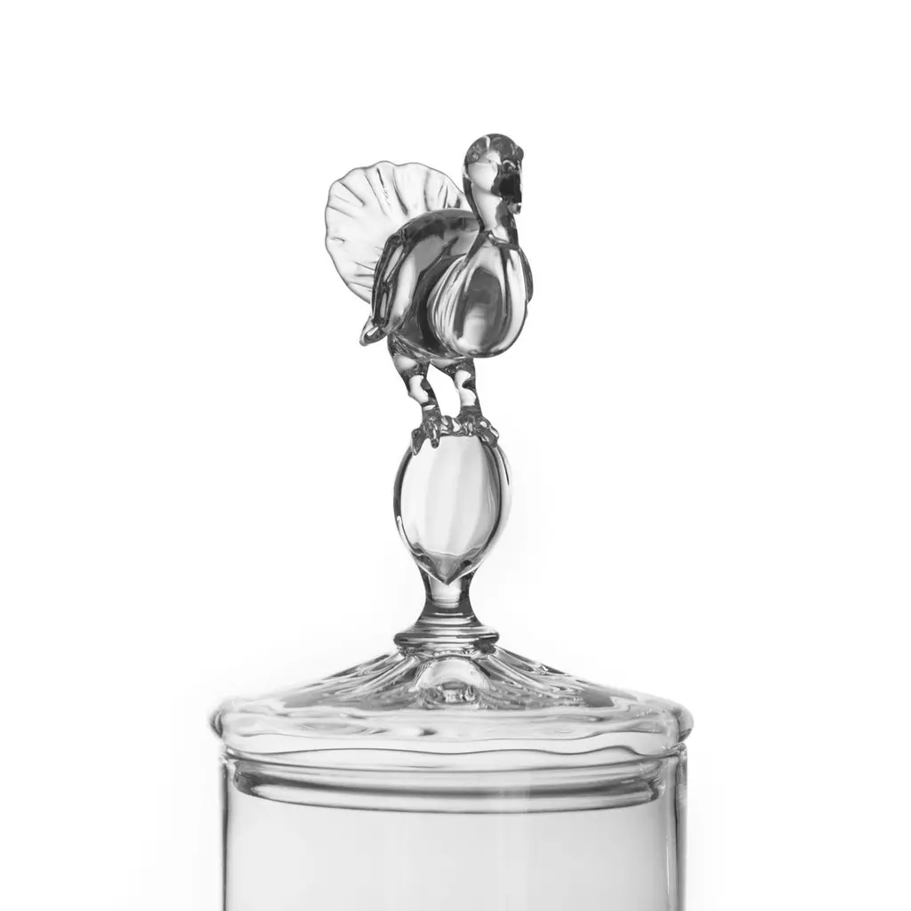 Introducing the Turkey Jar, a delightful handmade creation by the talented Simone Crestani. This exquisite jar is a captivating piece from the Little Animals Collection, where artistry and nature beautifully intertwine.The star of this enchanting jar is the intricately crafted turkey, proudly displayed on the lid. With its magnificent plumage and lifelike details, the turkey appears poised to strut into your heart, embodying a sense of charm and character. This exquisite detail transforms the jar into a unique work of art, celebrating the beauty and grace of one of nature's most beloved creatures.The Turkey Jar is not just a functional storage solution; it is a stunning decorative piece that adds a whimsical touch to any space. Perfect for holding treats, spices, or other treasures, this jar invites warmth and conversation into your home, making it an ideal centerpiece for dining tables or kitchen counters.A thoughtful gift for nature lovers and those who appreciate handcrafted artistry, the Turkey Jar captures the spirit of the wild while offering a charming accent for any decor. Let it remind you of the beauty of the natural world, enriching your surroundings with its playful elegance.Dimensions: diameter 11 height 32 cmMaterials: Borosilicate GlassPlease note: Each jar is lovingly handcrafted, resulting in slight variations that enhance its unique character.