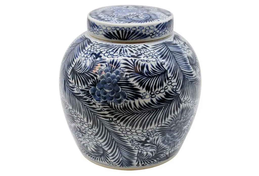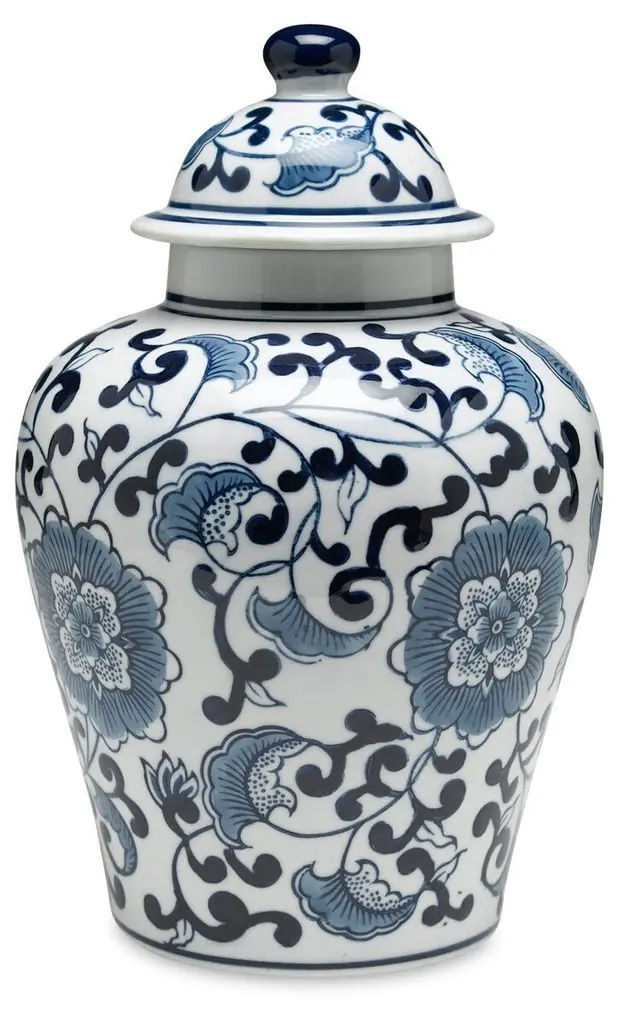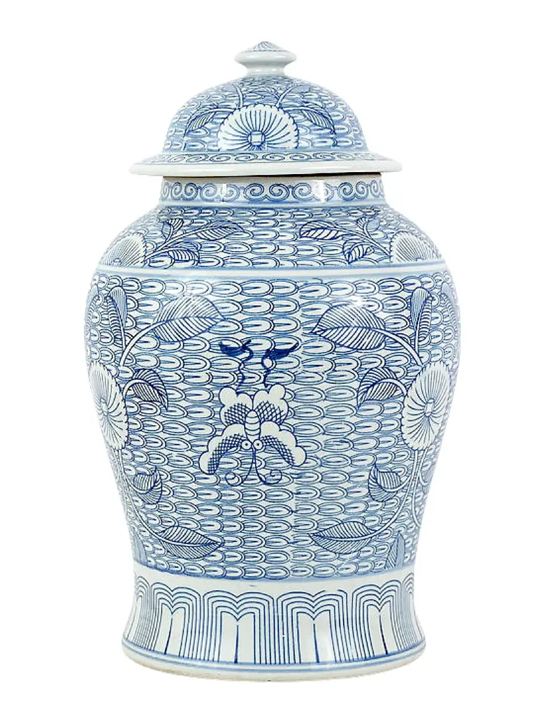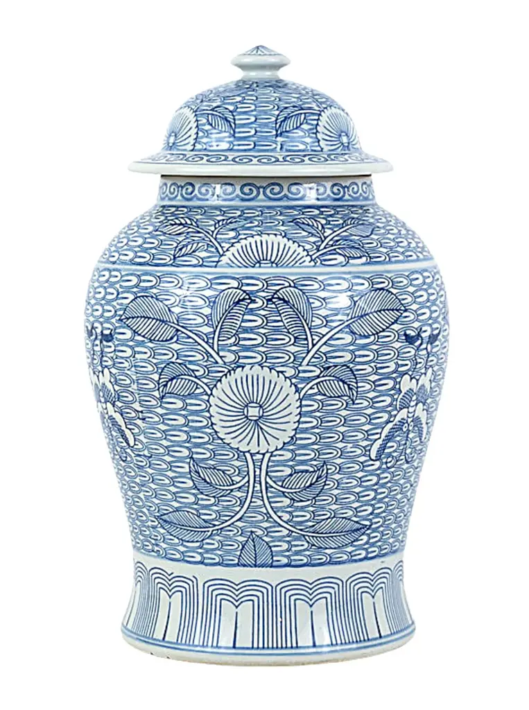 This is a contemporary blue and white tessellated floral design. This is a beautifully designed porcelain jar. This is in new condition and stands approximately 18 inches high and is 11 inches wide at the widest point