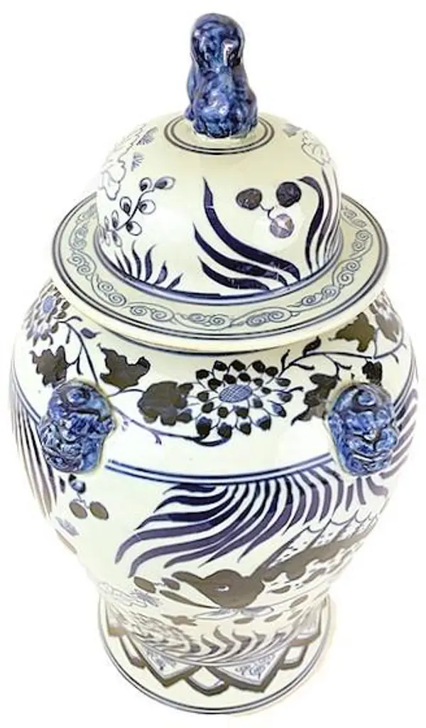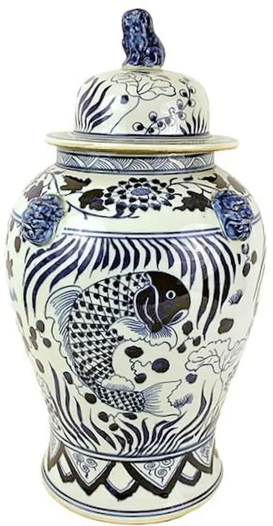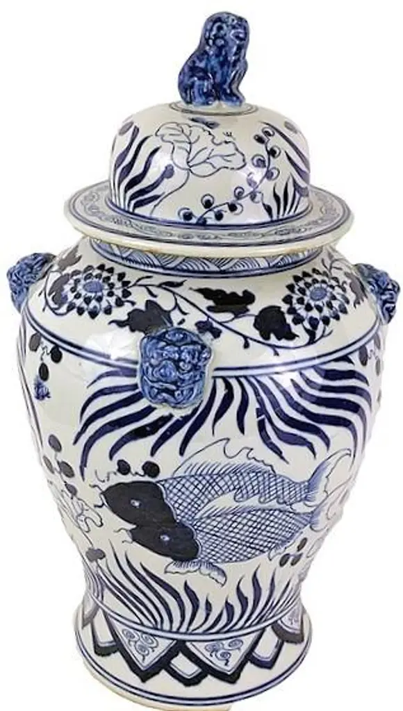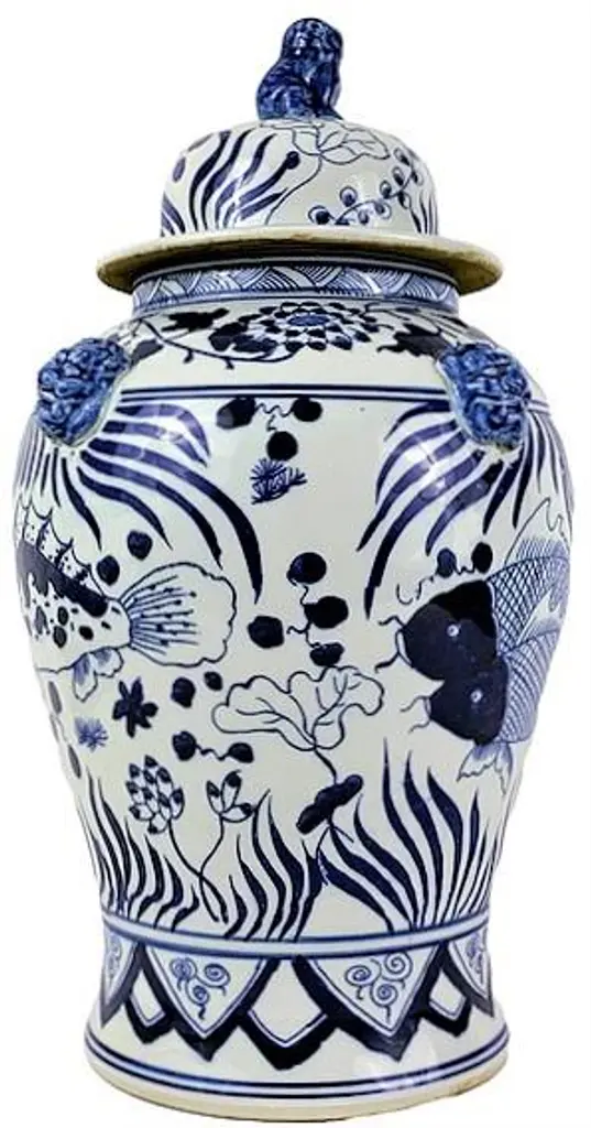 This is a beautiful blue and white porcelain Balaster Temple / Ginger Jar with a vibrant design of beautiful sea life and Koi fish. The top has a large foo dog finial in dark blue and the sides have blue foo dog handles. This has an amazing design and would look fantastic in any location or décor. These jars look great on top of a Console or in front of a fireplace or mantle. They look great mixed in with other blue and white porcelain in a grouping! This one is perfect for a coastal location. Newly made.