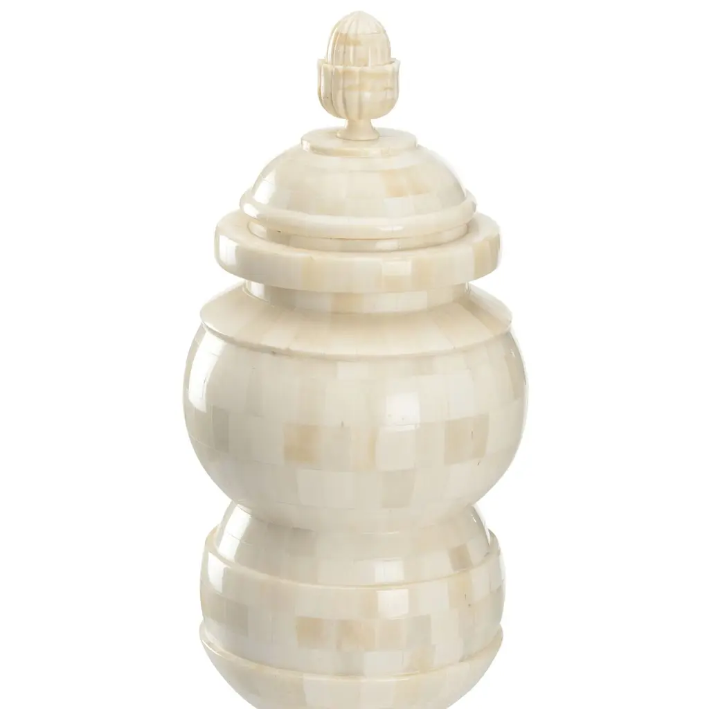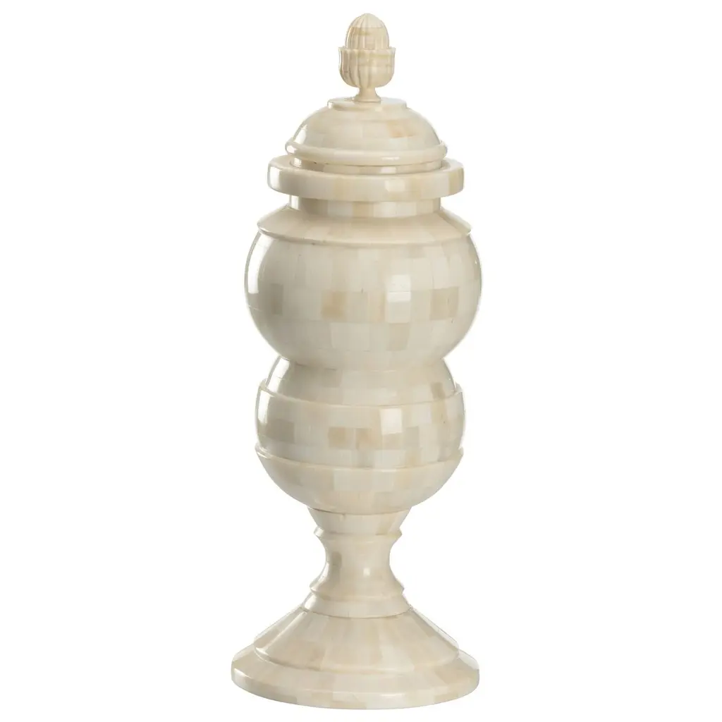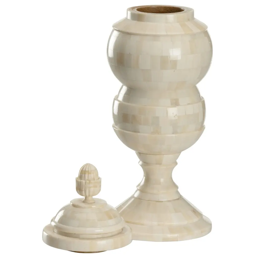 The Cyrus Bone Jar is a captivating blend of natural materials, featuring an intricate bone inlay pattern.