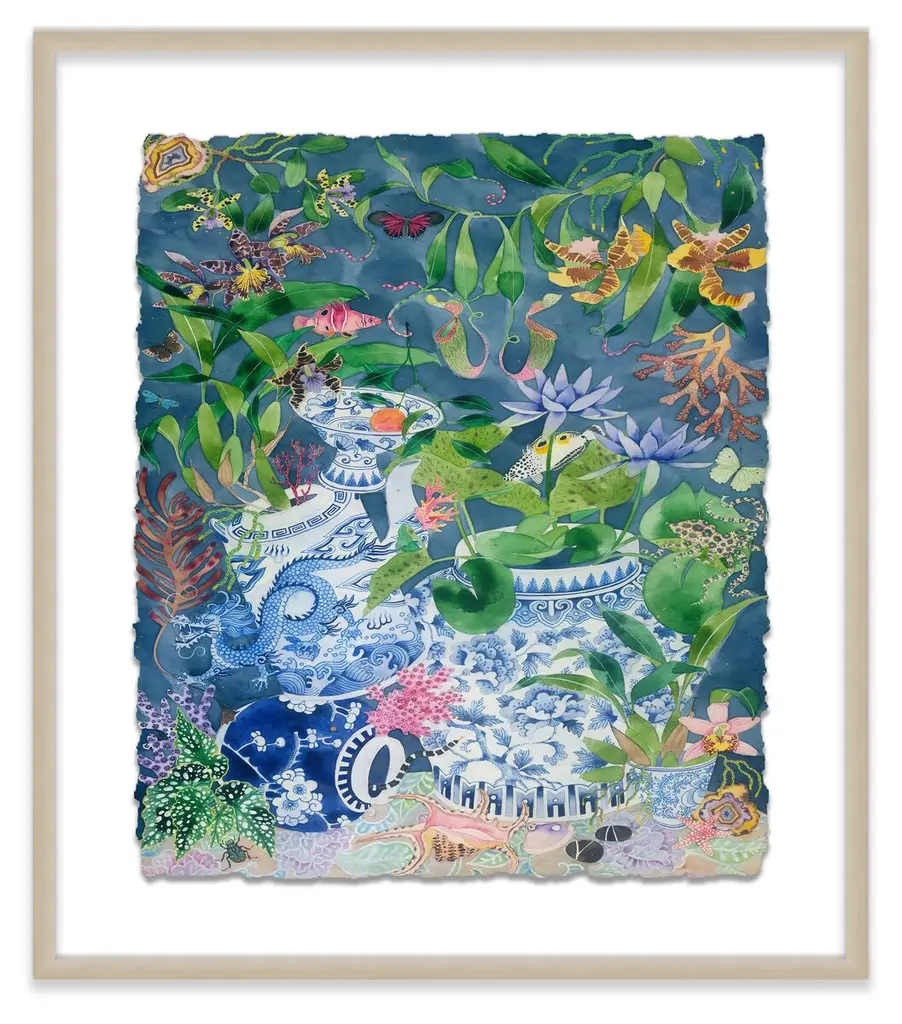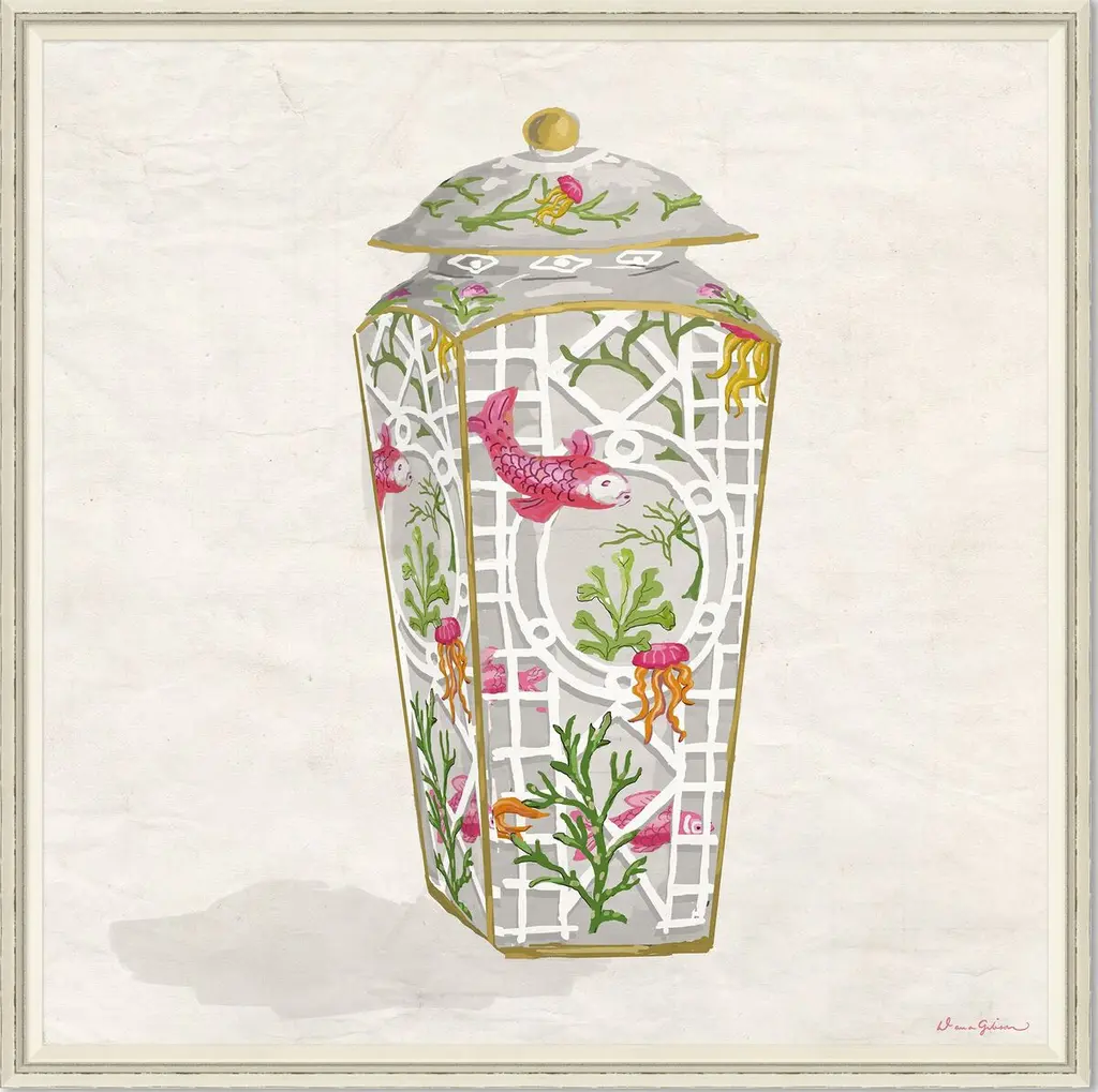An artist as well as a designer, Dana Gibson is known for adding vibrancy to traditional motifs. Her painting of a chinoiserie jar, reproduced here as a giclée print on archival paper, is a case in point. The print arrives framed and ready to hang.