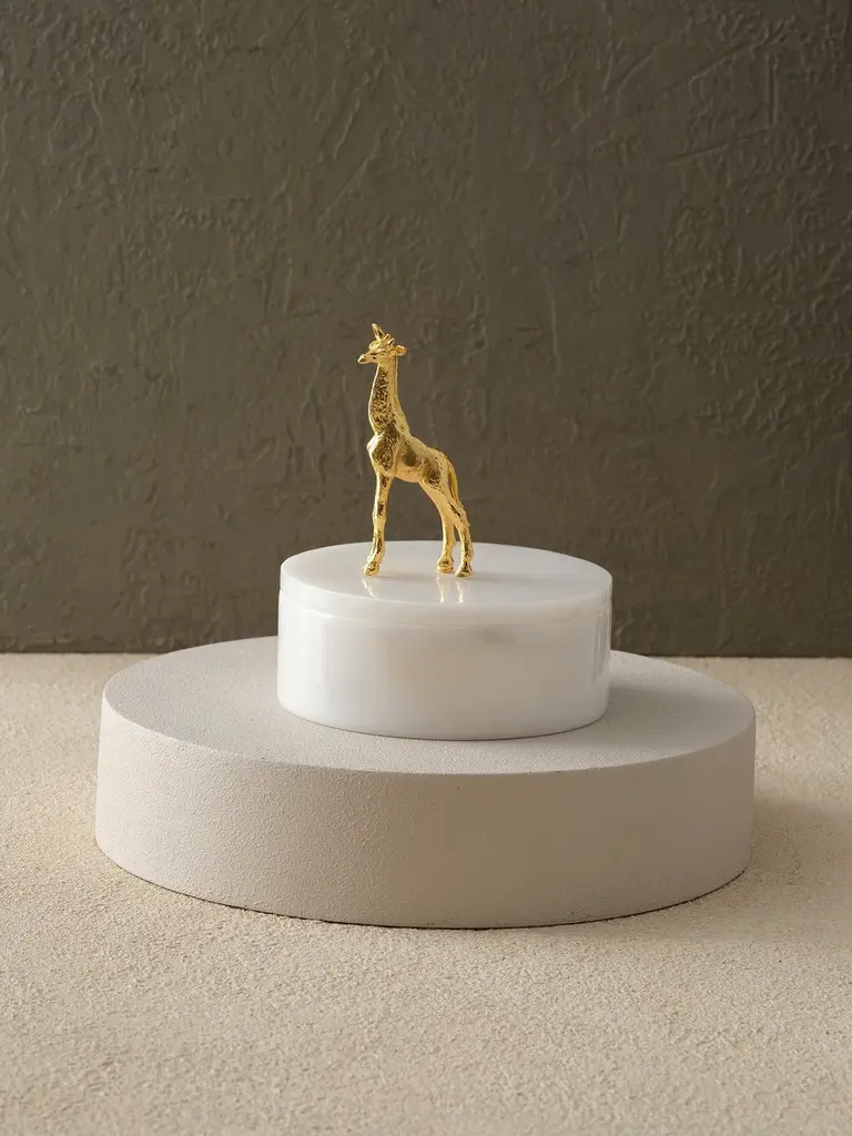 Add a whimsical yet sophisticated touch to your space with this Decorative Giraffe-Lid Storage Jar. Crafted with a smooth, ivory-toned ceramic base and topped with an elegant gold-tone giraffe figurine, this piece effortlessly blends functional storage with artistic charm. The sculptural lid brings a hint of safari-inspired luxury to vanity tables, console surfaces, or shelves. Whether used to store trinkets, treats, or simply as a statement piece, it captures attention while offering understated elegance. Ideal for eclectic interiors or those seeking a playful accent with elevated style.
