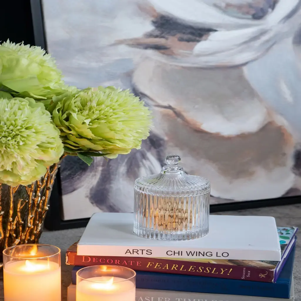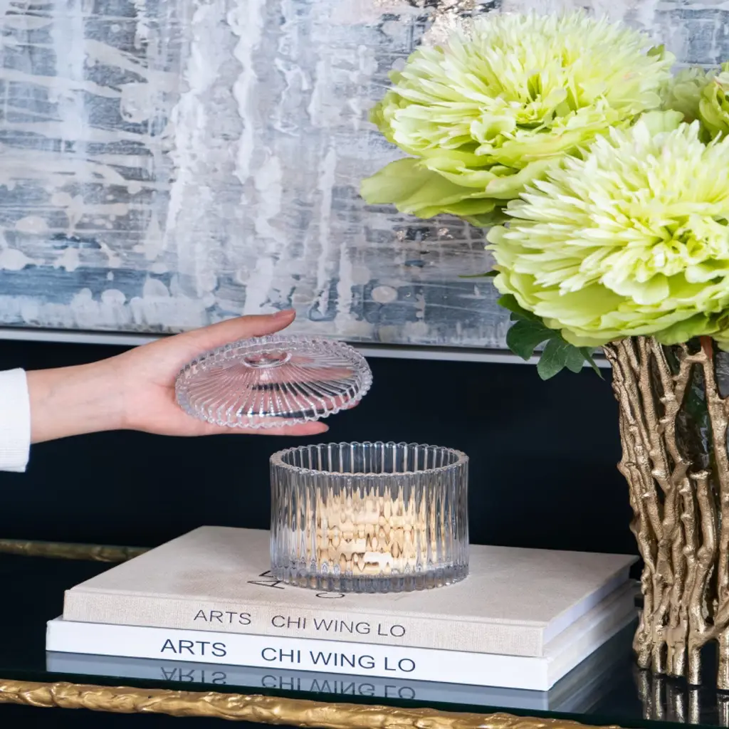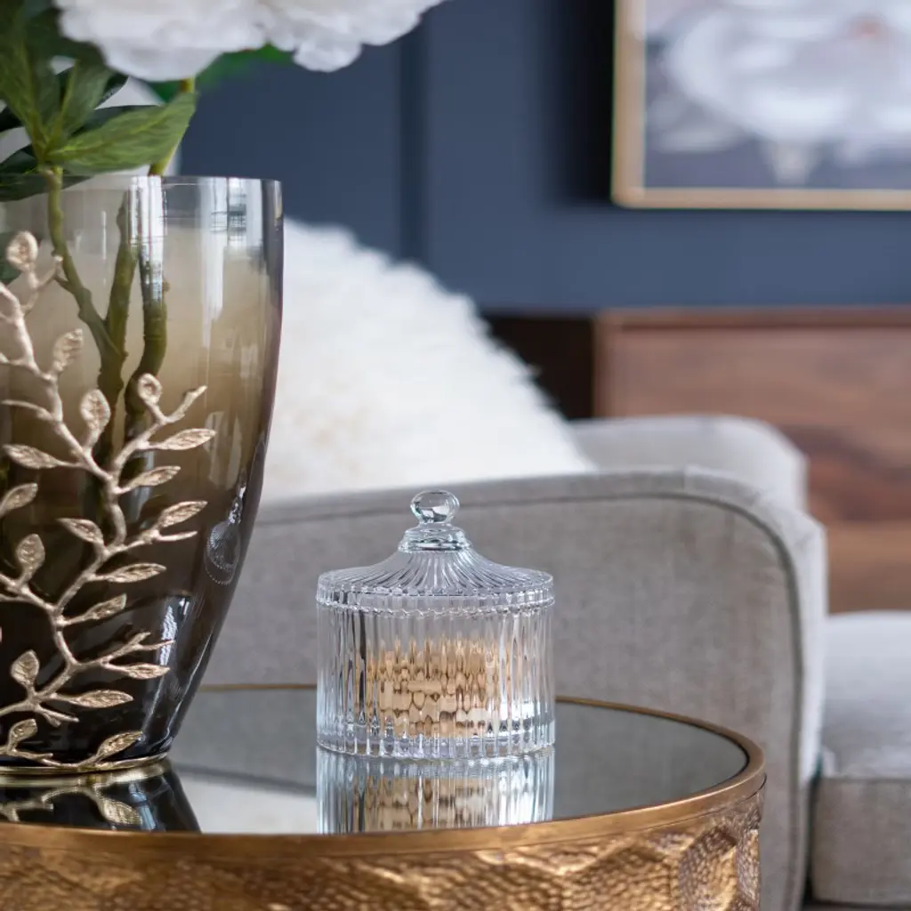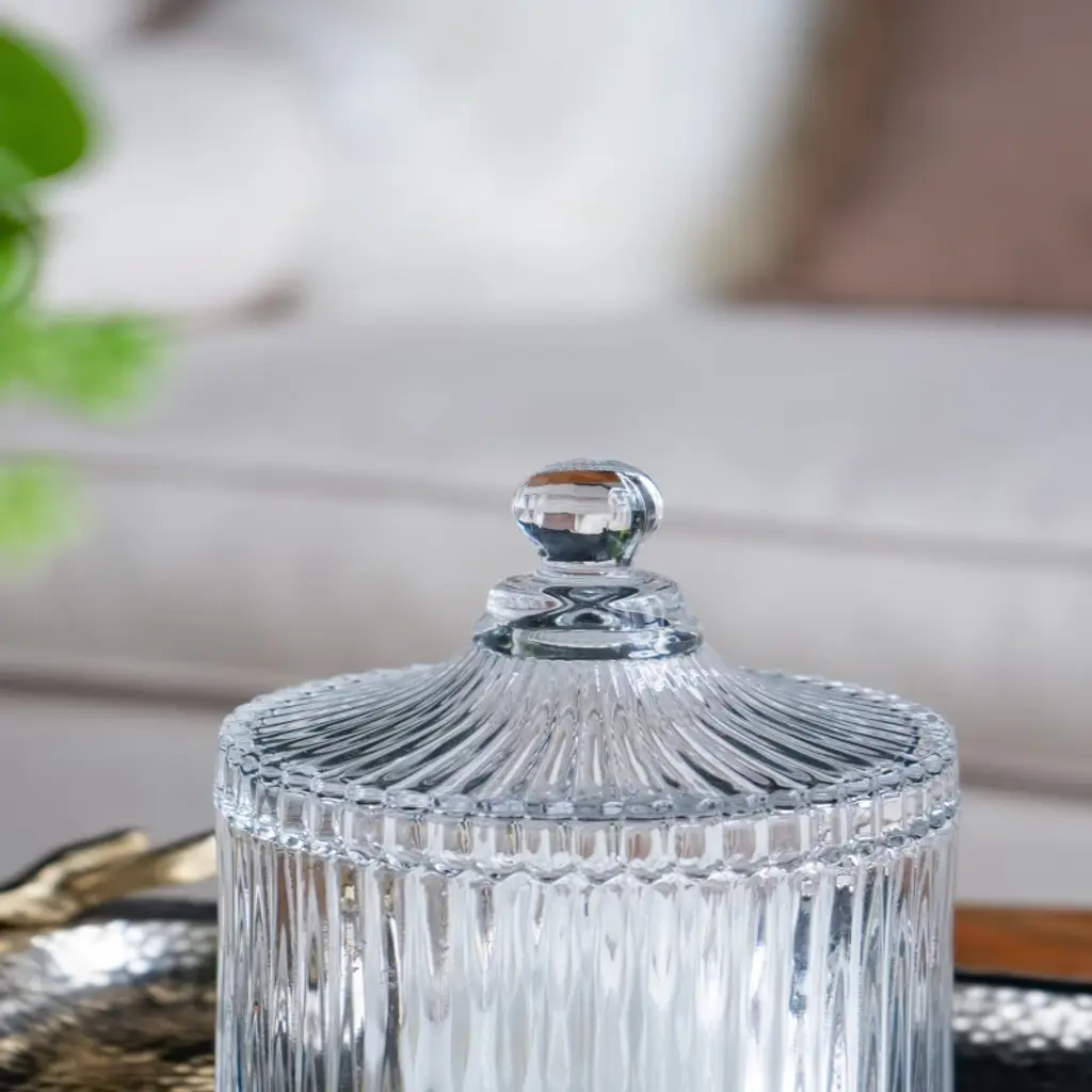 The Ancell Lidded Glass Jar features a finial-topped lid that curves down into ribbed sides. Use this traditional piece in the kitchen, living room, or master bathroom to store tea bags, candy, or small bathroom items. The Ancell Jar offers all the glittering beauty of a classic glass piece combined with the ability to store and organize small items.