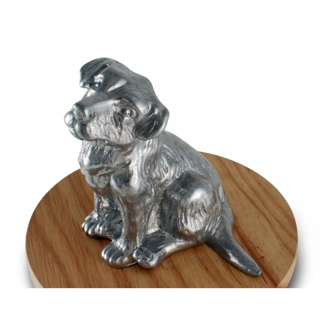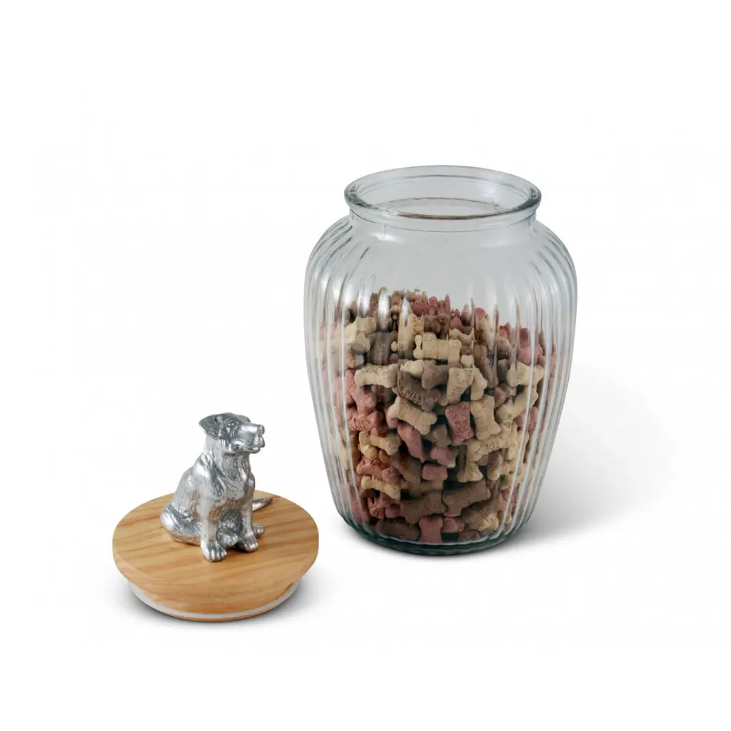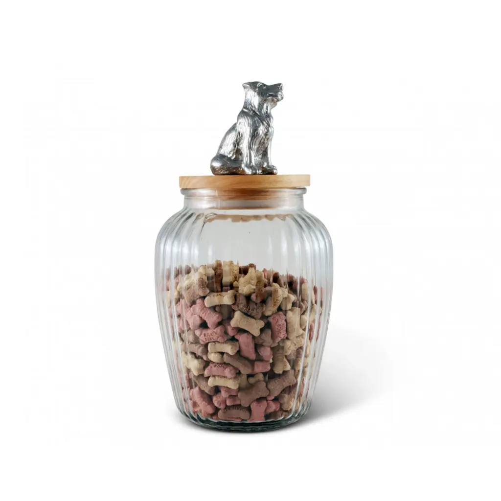Lovely glass jar is topped with an environmentally sustainable Acacia wood lid. Detailed metal art in aluminum, a cute pup waiting for a treat, tops the jar. A premium silicone sealing ring with an air tight seal maintains perfect environment for keeping Fido's treats the freshest