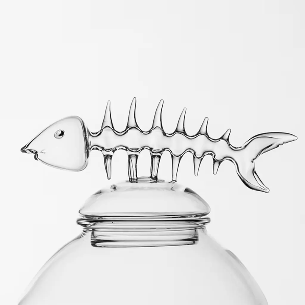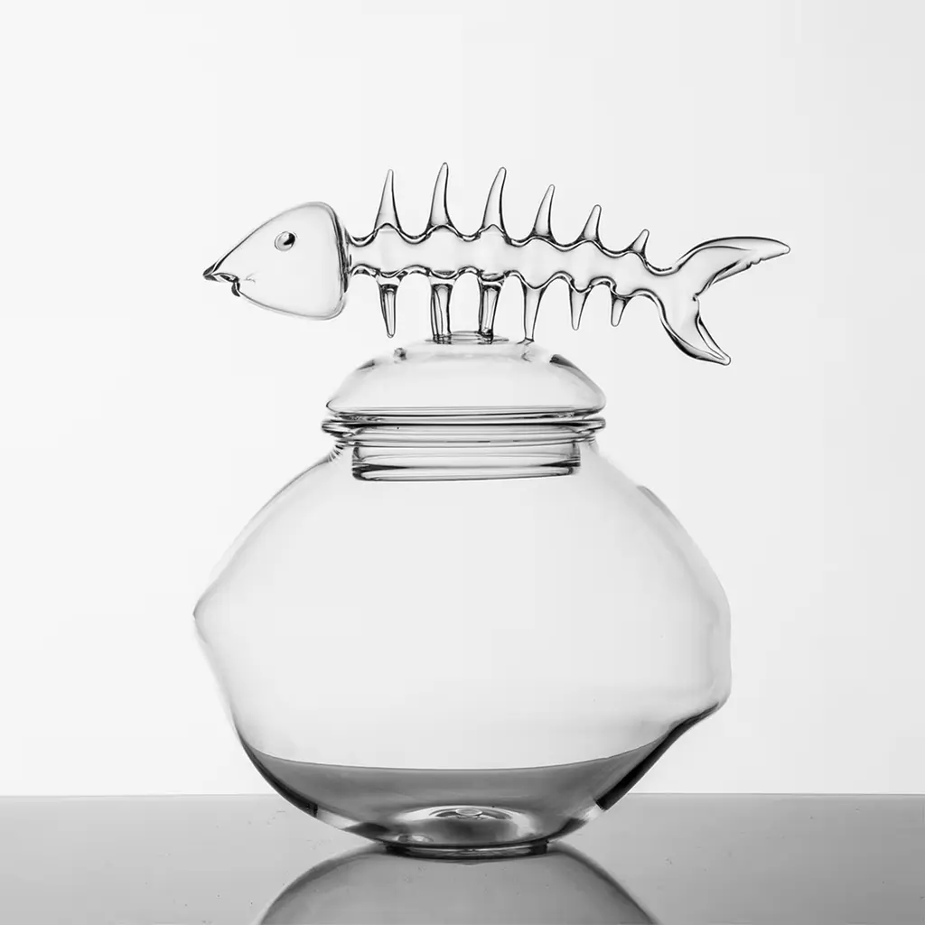Impeccable lamp-blown borosilicate glass gives this ornamental jar with a fishbone handle a crisp transparency. An eccentric design that exemplifies the innovative ideas of glass artist Simone Crestani while remaining based on traditional glass blowing techniques.