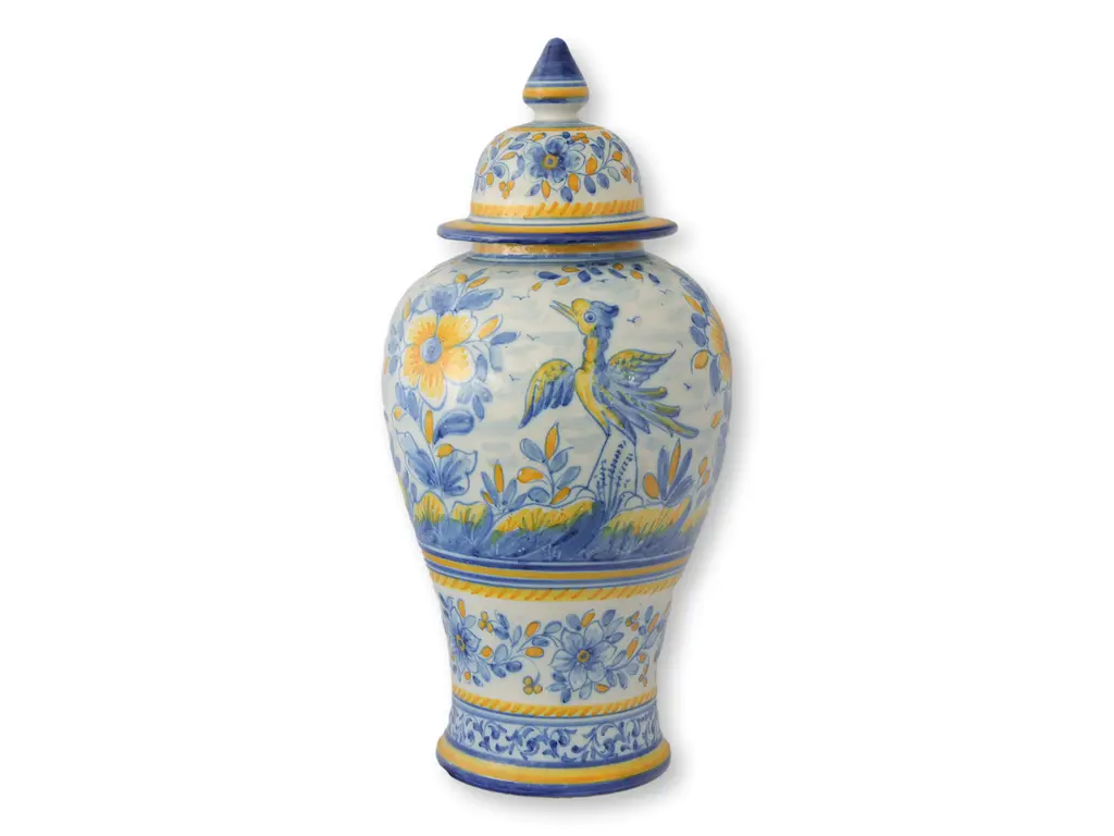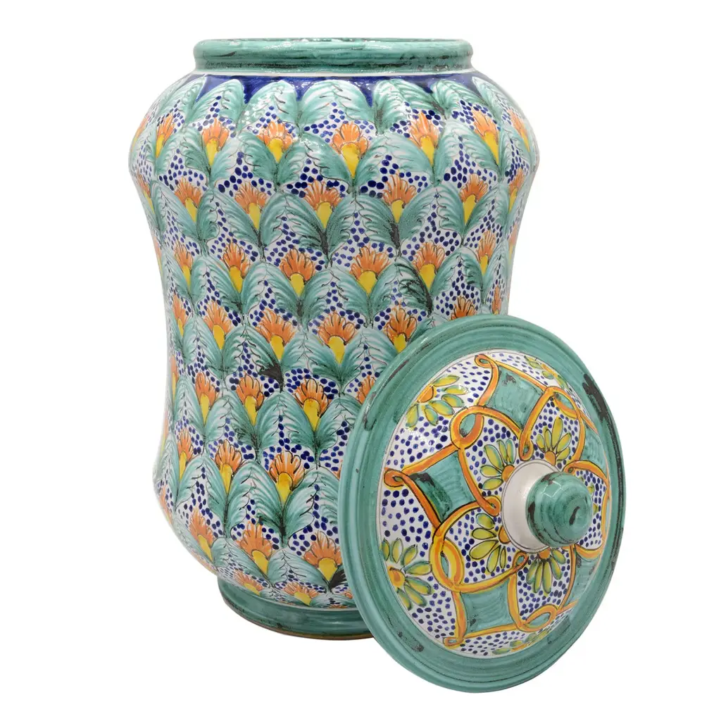 This jar was crafted and exquisitely decorated entirely by hand, and it comes complete with an elegant lid. The motif adorning its surface is of the Foglina Turchese, a variant of the peacock feather patter. Traditional Tuscan ceramic techniques characterized by the turquoise, orange, and blue color palette, were used in the making of this piece of exquisite craftsmanship. A classic decor will be complemented by the addition of this artisanal vase.