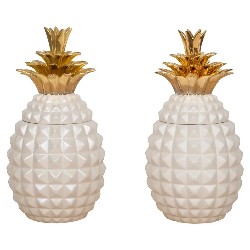 Add a tropical touch to your interior with the sophisticated Hayworth Jar. This elegant pineapple container is made of glass and has a crown and base with a vintage brass finish. Both a dramatic accent and a handy storage pot. Add a tropical touch to your interior with the sophisticated Hayworth Jar. This elegant pineapple container is made of glass and has a crown and base with a vintage brass finish. Both a dramatic accent and a handy storage pot.