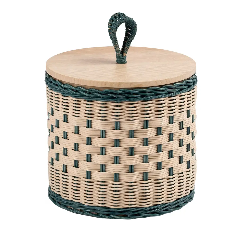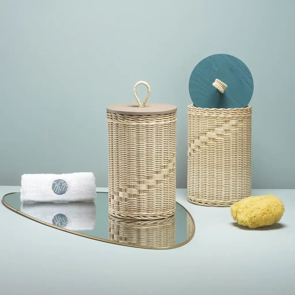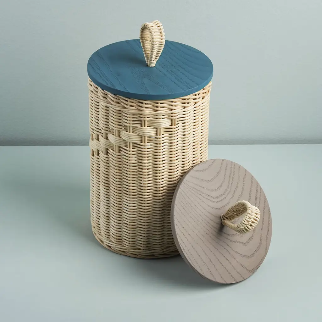 Versatility and aesthetic almost literally intertwine in this exquisite cylindrical wicker container, topped off by a flat, round lid in solid ash stained in teal following the open pore method. Protected by a special water-based treatment, the minutely handwoven container and loop boast intricate wefts reflecting the expertise of the artisans who crafted it. Please ask the Concierge for pink, natural, and hazelnut color options for the lid.