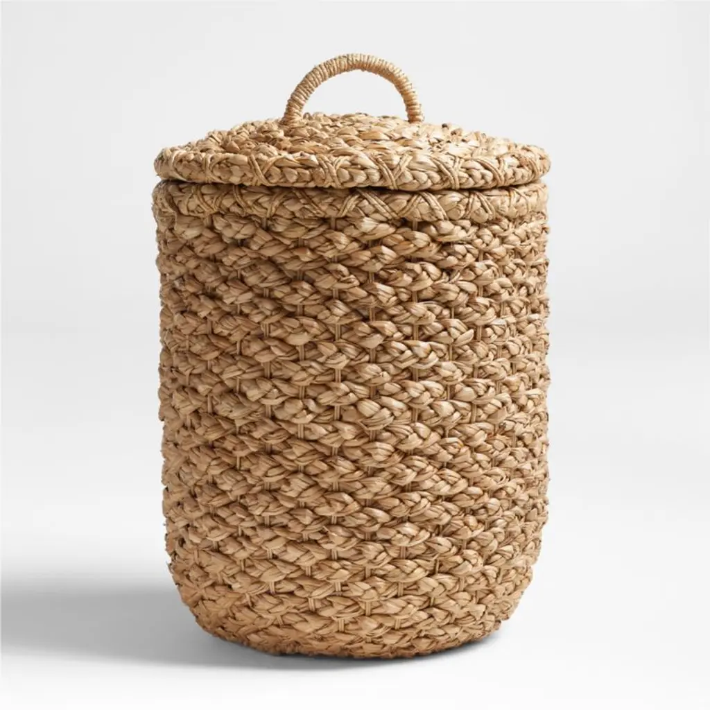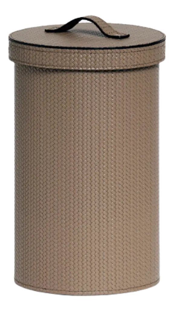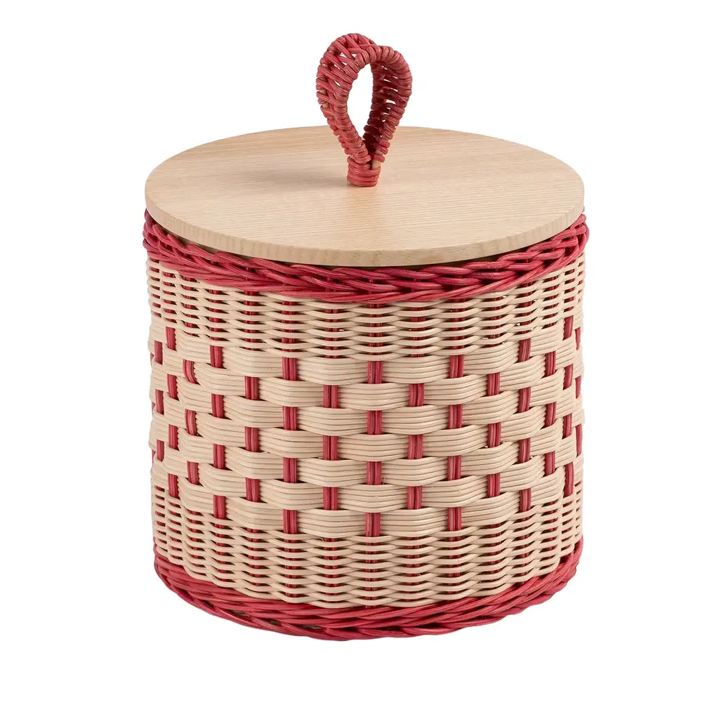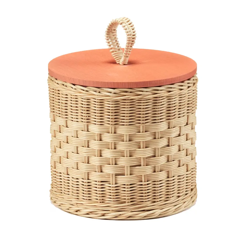 Versatility and aesthetic almost literally intertwine in this exquisite cylindrical wicker container, topped off by a flat, round lid in solid ash stained in teal following the open pore method. Protected by a special water-based treatment, the minutely handwoven container and loop boast intricate wefts reflecting the expertise of the artisans who crafted it. Please ask the Concierge for pink, natural, and hazelnut color options for the lid.