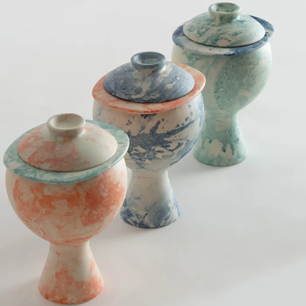 A singular piece of functional decor, this herbal jar will elevate any table setting set with unique sophistication. Crafted of white clay, its sinuous silhouette is enhanced by mesmerizing blue hues with marbled finish inspired by the Florentine marbled cards. This splendid piece is completed with a lid that can be used as a cup for the tea.