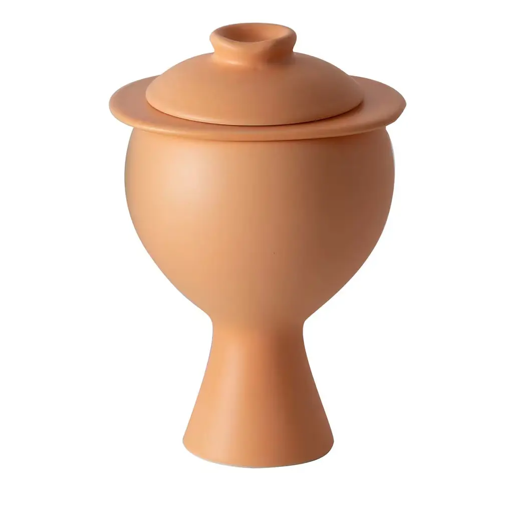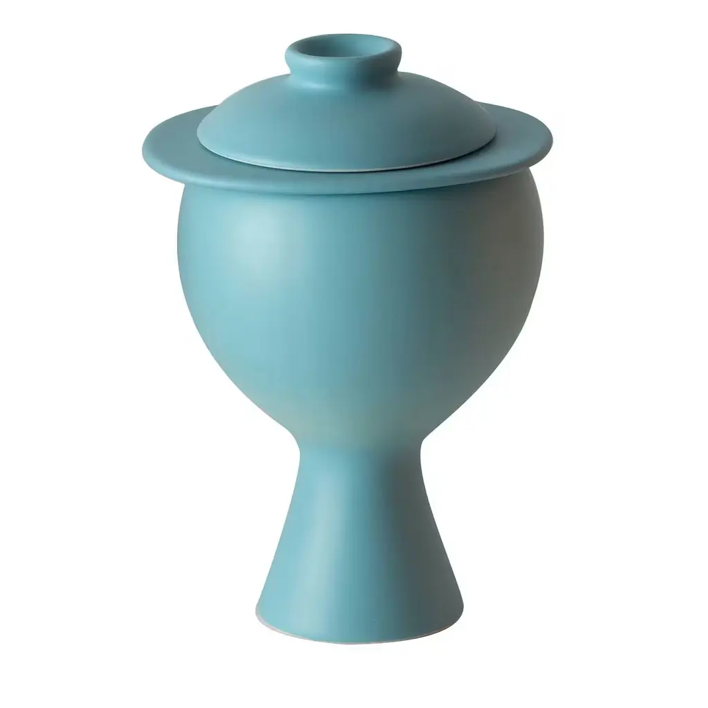 An elegant and sophisticated piece of functional decor, this herbal jar will add a unique look to a dining set. Exquisitely crafted of white clay and finished with a matte grey enamel, this piece is made using a plaster mold. Its imposing and generous silhouette is enriched by a sleek and functional lid that may be used as a cup to serve the tea.