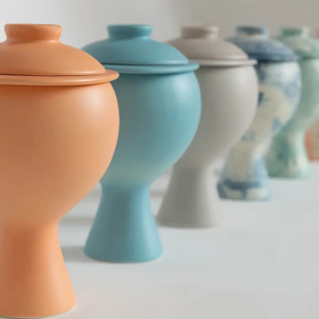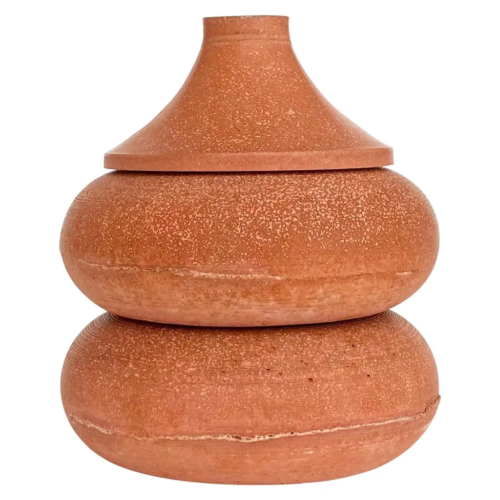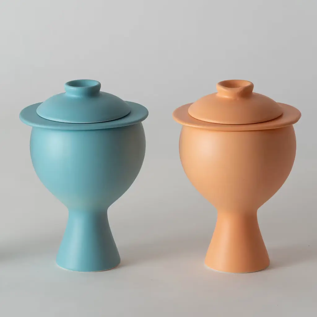 Recalling the ancient and sacred vases from the Greek and Roman empires, this splendid herbal jar has a sleek and sophisticated allure. Handcrafted in a plaster mould, the white clay is completed with a rustic matte orange finish.