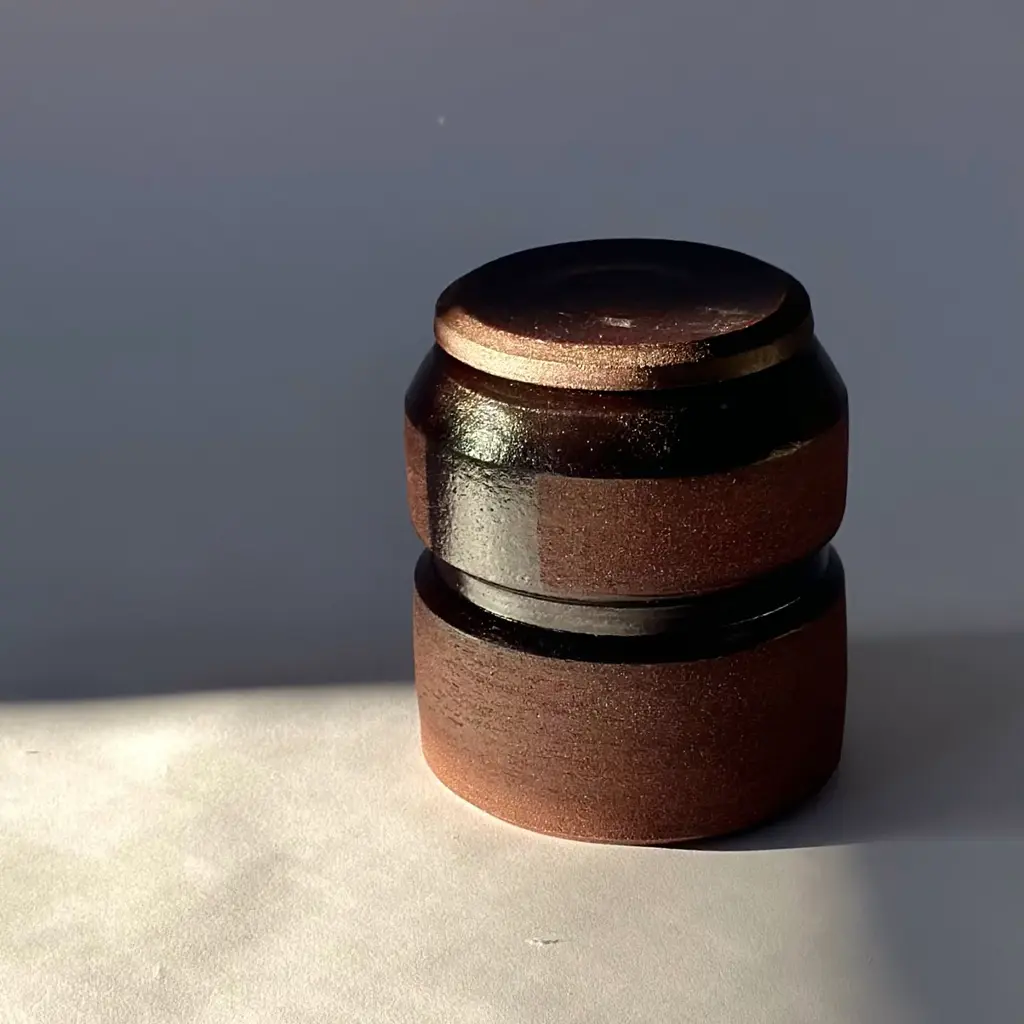 A hand-thrown lidded jar designed to be as versatile as it is beautiful. The contrast of raw clay with a bold glazed stripe gives each piece a modern, design-forward character while celebrating the natural material. Perfect for tea, coffee, and sugar. Everyday essentials elevated through form and material. Wheel-thrown in a warm, earthy clay and finished with bold vertical strokes of glossy glaze, they bring a design-forward sensibility to the kitchen.Functional yet sculptural, the jars celebrate clean lines and modern craftsmanship. Their tactile surfaces and rich contrasts add quiet luxury to daily rituals, making even the simplest moments feel considered.
