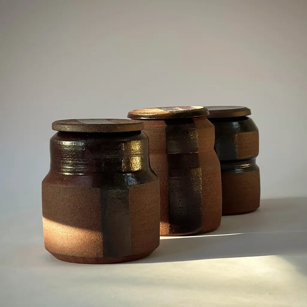 These three lidded jars are designed as the perfect set for tea, coffee, and sugar. Everyday essentials elevated through form and material. Wheel-thrown in a warm, earthy clay and finished with bold vertical strokes of glossy glaze, they bring a design-forward sensibility to the kitchen.Everything from Clay and Limes is always low in stock as Tash makes everything by hand in her East London studio. Everything she makes is unique, often making works that are sisters rather than twins. Functional yet sculptural, the jars celebrate clean lines and modern craftsmanship. Their tactile surfaces and rich contrasts add quiet luxury to daily rituals, making even the simplest moments feel considered.
