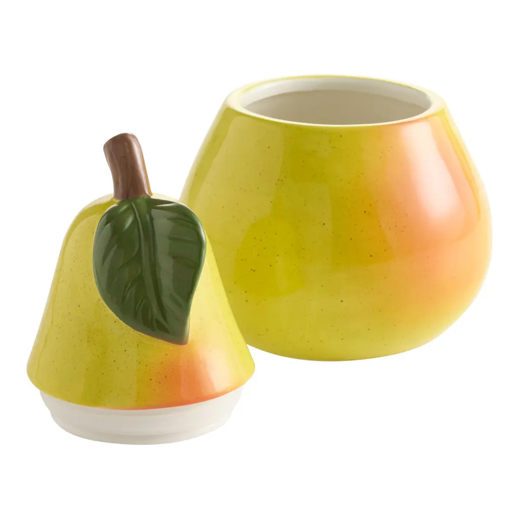 The farmers-market flair of our pear-shaped ceramic cookie jar brings a handcrafted, autumnal vibe to your counter and table in sun-ripened harvest hues. Subtly speckled and topped with a lid featuring an earthy brown stem and textural green leaf, this treat jar draws the eye with its finely detailed dimension. Keeping baked goodies sealed with an airtight lid, this useful artisan gift celebrates the rustic beauty of the fall countryside.
