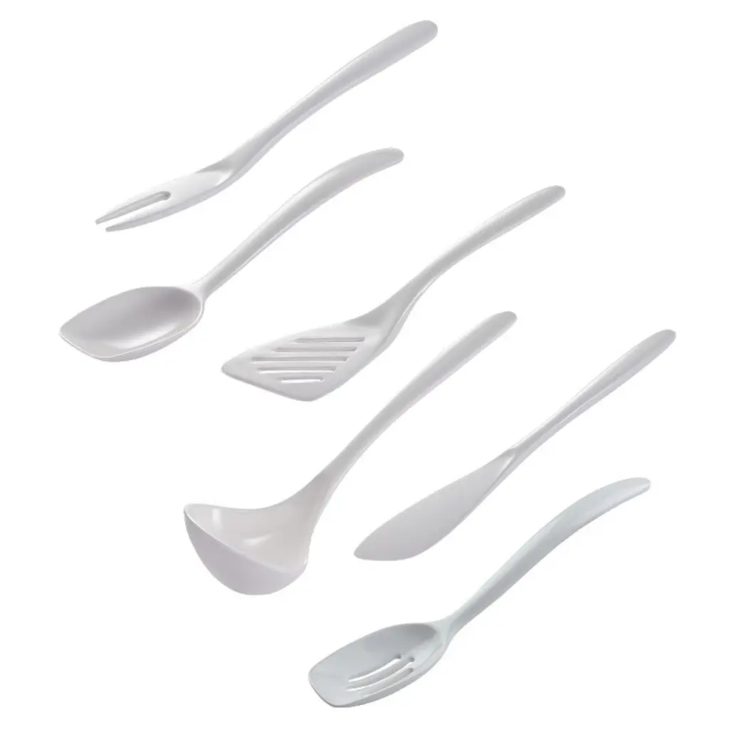 This great set includes all 6 Mini Utensils and a stylish Storage Crock. Each utensil has all the features you expect from Hutzler: dishwasher safe, heat resistant, safe on nonstick cookware, and permanent shine.The 7-piece set includes: Mini Spoon (7.5 inches long, great for tasting, stirring and serving), Mini Slotted Spoon (7.5 inches long, great for straining and serving), Mini Spreader (7.75 inches long, great for spreading condiments and frosting), Mini Fork (7.75 inches long, great for reaching into narrow jars and serving), Mini Slotted Turner (7.75 inches long, great for preparing cookies, candies and appetizers), Mini Ladle (7.5 inches long, great for serving gravy, sauces and toppings), and a color match Storage Crock for conveniently storing all the utensils in.All utensils are safe on your best nonstick cookware and are heat-resistant to 360 degrees F. Made of high-quality BPA-free melamine, these tools are strong and durable, lasting for years and maintaining their permanent glossy shine. Made in Thailand. Dishwasher safe.