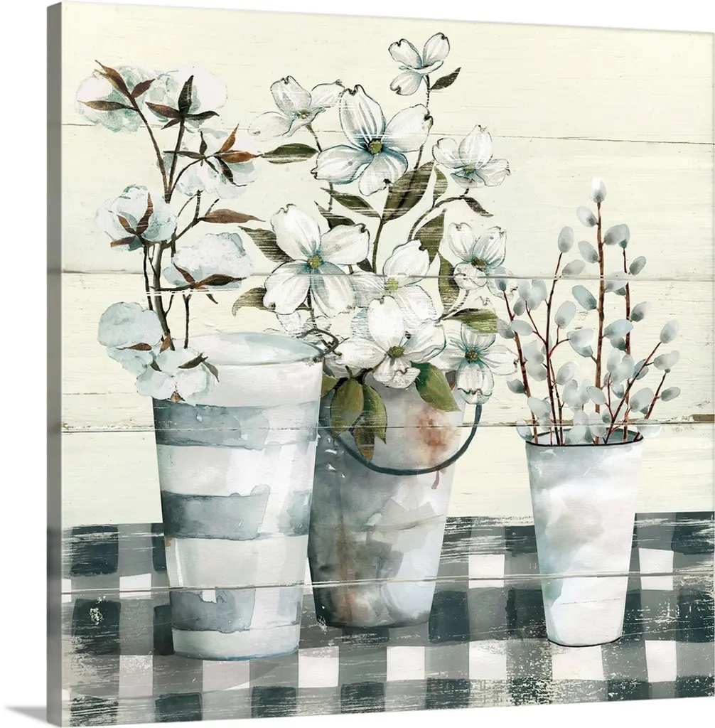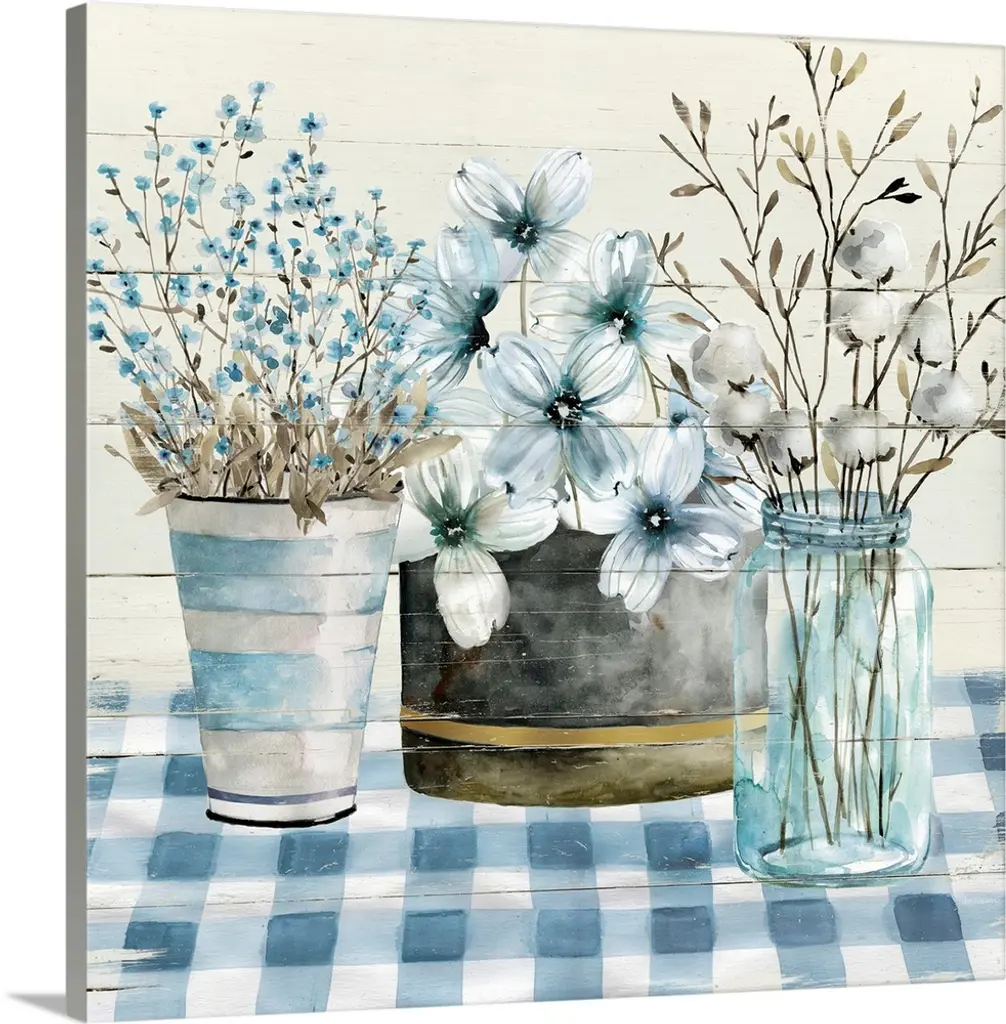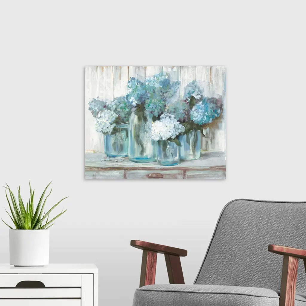 Hydrangeas in Glass Jars Blue wall art for home and office decor. Discover canvas art prints, photos, mural, big canvas art and framed wall art in GreatBigCanvas.com's varied collections.