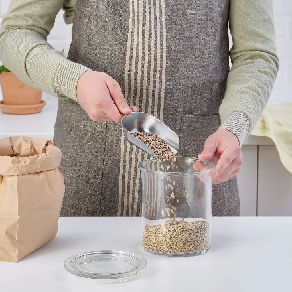 IKEA 365+ Jar - round/glass 57 oz. Made of glass, which does not absorb odors or discolor from tomato sauce, etc, so the food container is easy to clean. The transparent jar makes it easy to find what you are looking for, regardless of where it is placed. Fits with IKEA 365+ round-shaped lids.